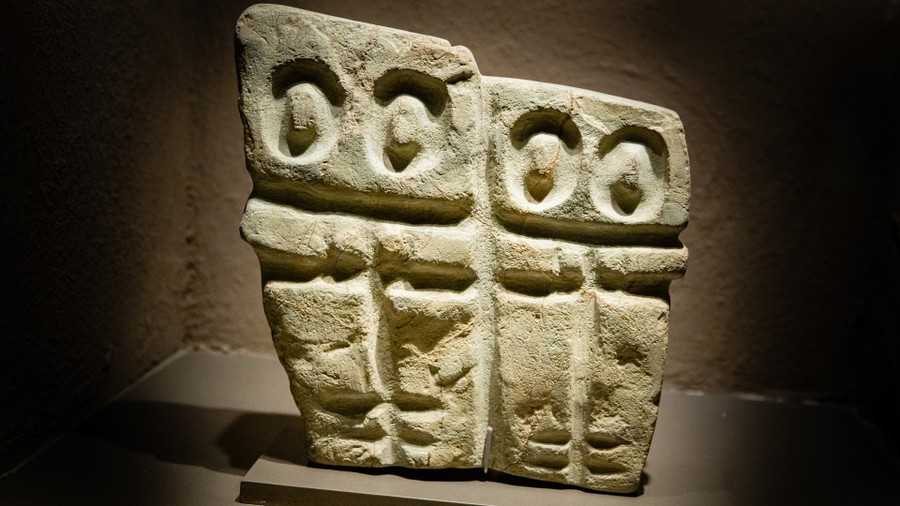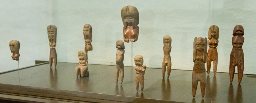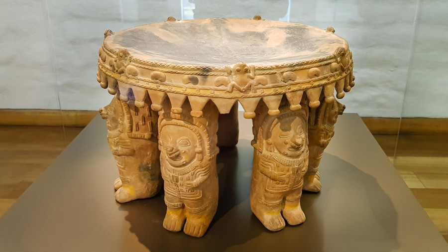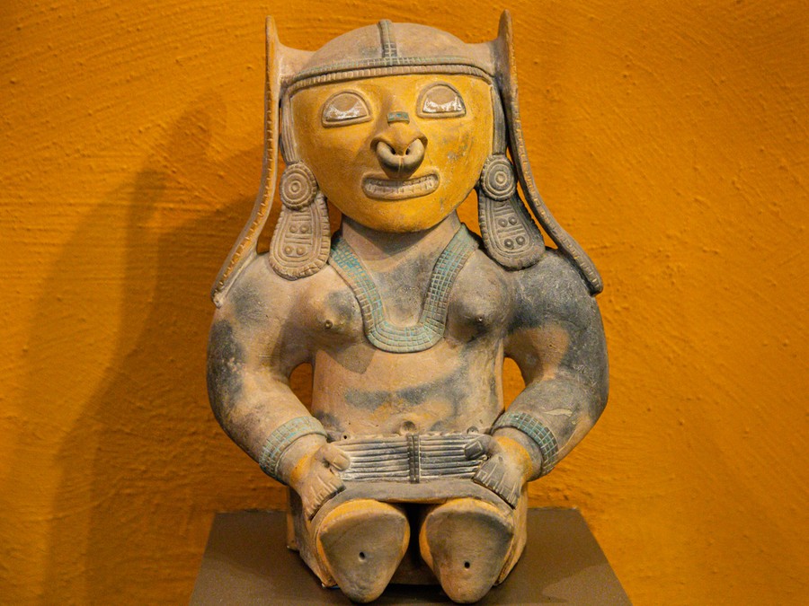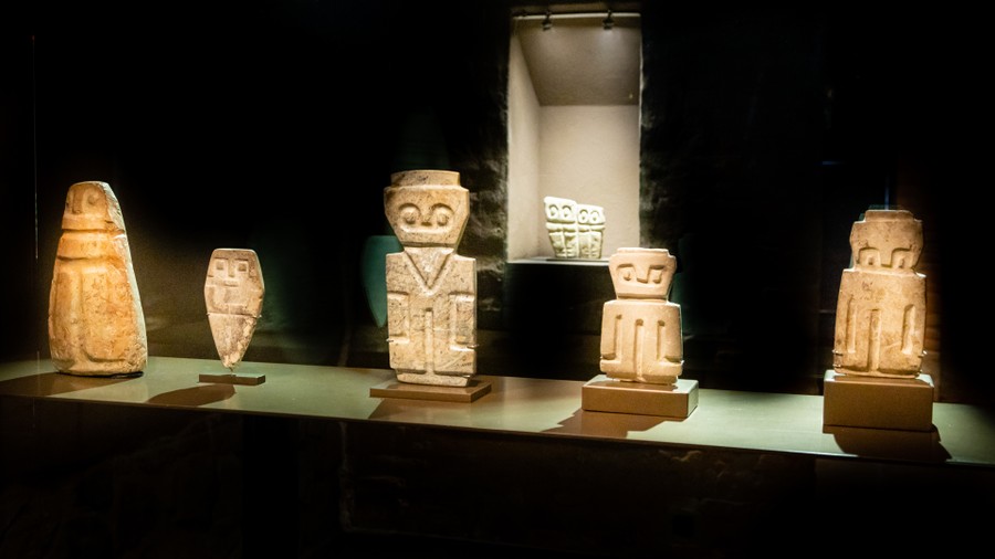 Először a halállal foglalkozó, nagyjából ötezer éves kőfaragványokat láthattunk, amelyek a Csendes-óceáni partvidékről származnak. Voltak egészen absztrakt, a mai világban is modernnek számító szobrok, voltak fejfáknak használt figurák, és felismerhetőbb, szögletes kimunkálású ábrákkal díszített kövek. Mindegyik precízen megmunkált volt, és baglyot ábrázolt. Azért éppen baglyot, mert az lát a sötétségben, tehát lát a túlvilágon, így tudja mi van ott, sőt így átjárása van a két világ között, és vezetni tudja az útjukon a lelkeket.