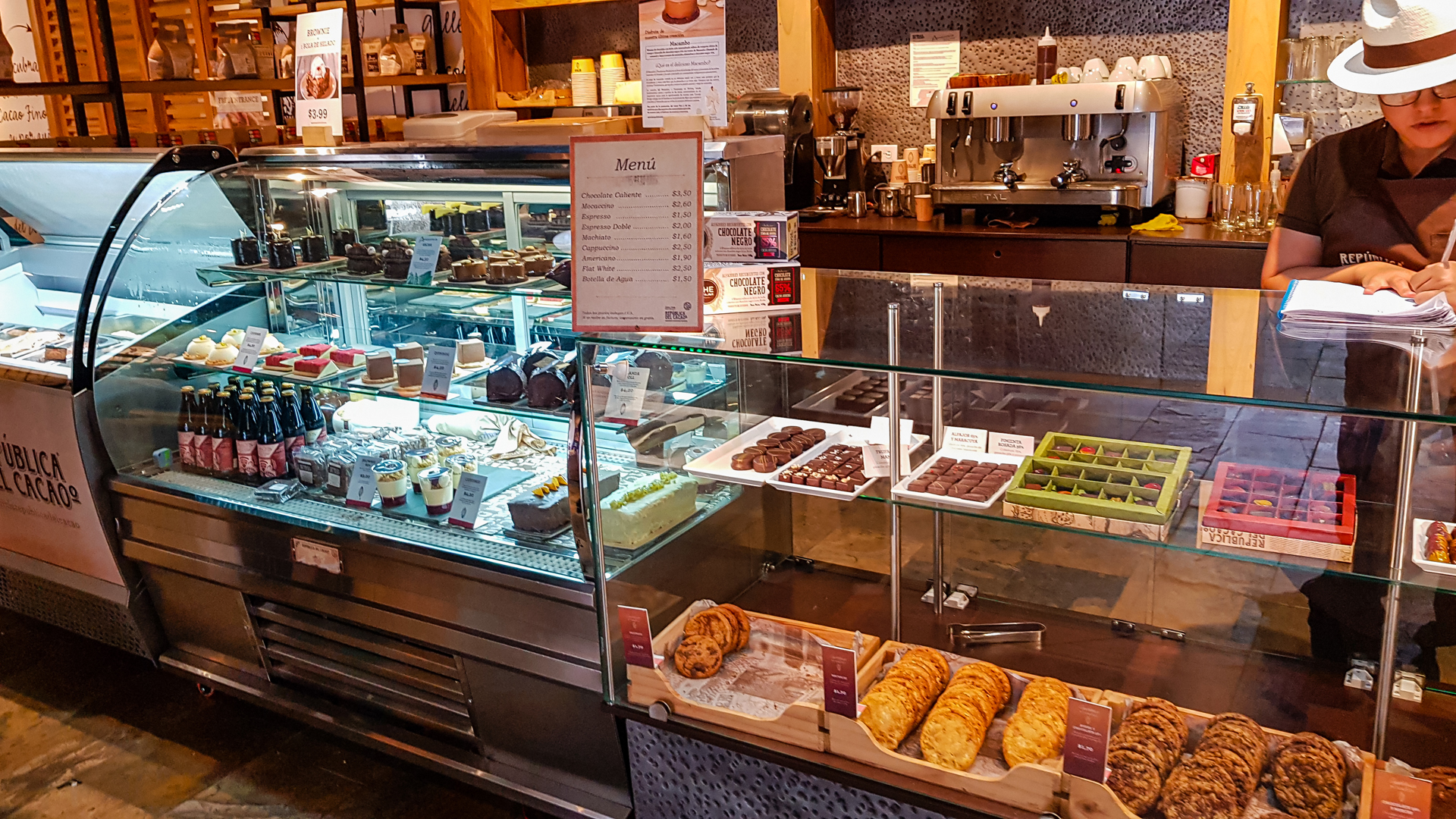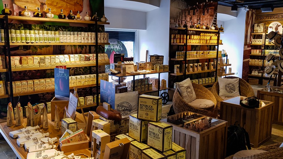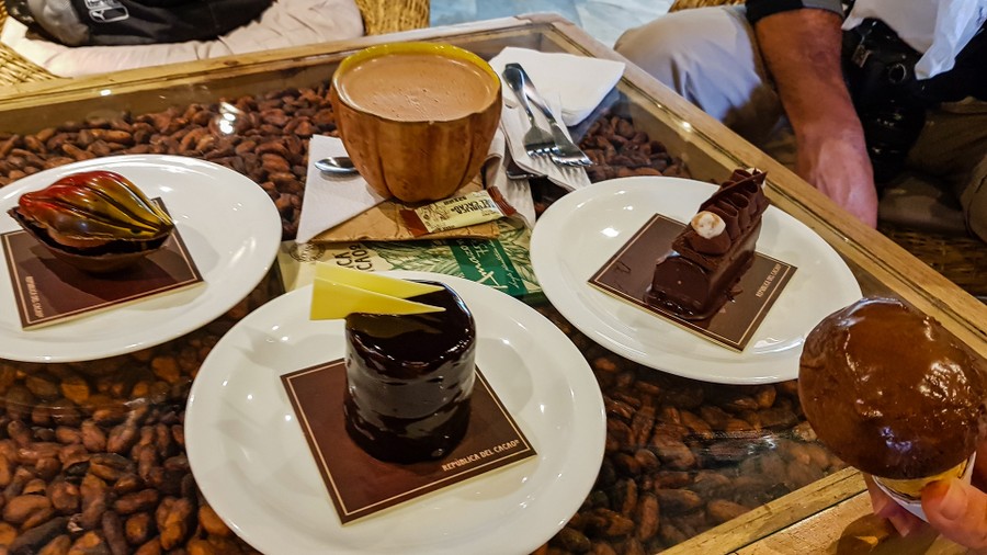 Utolsó Ecuadori programunk egy csokimúzeum és csokotéria meglátogatása volt. A múzeum a kakaóültetvény után nem volt különösebben izgalmas, de a sütikínálat annál inkább. Kértem belőlük egy félasztalnyit forró csokival, és 70%-os csokifagyival. Innentől megállt az idő, és boldog, barna mámorban úsztam az idő barna végtelenjében. De mint minden ez is véget ért, és visszacsöppentem a való világba.
