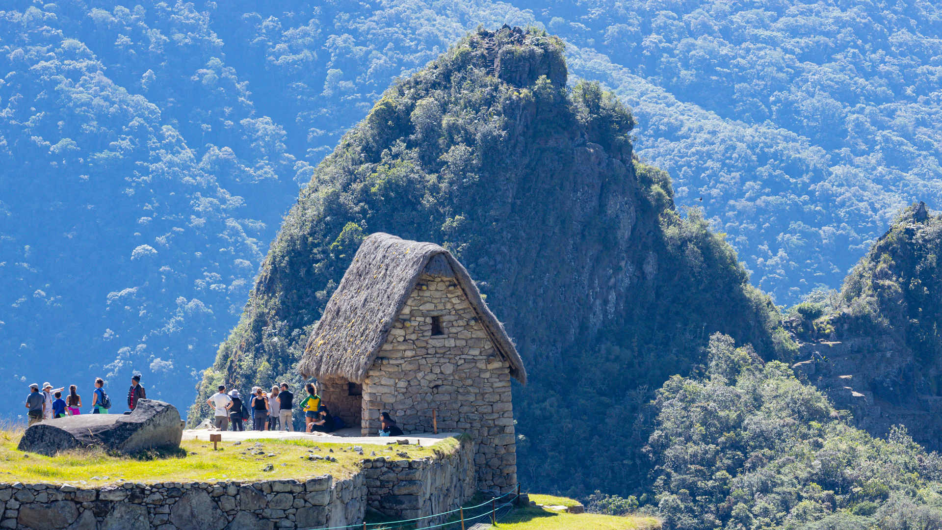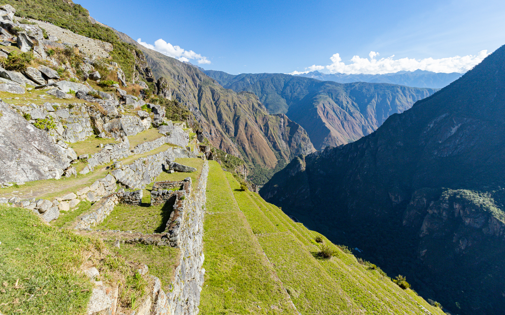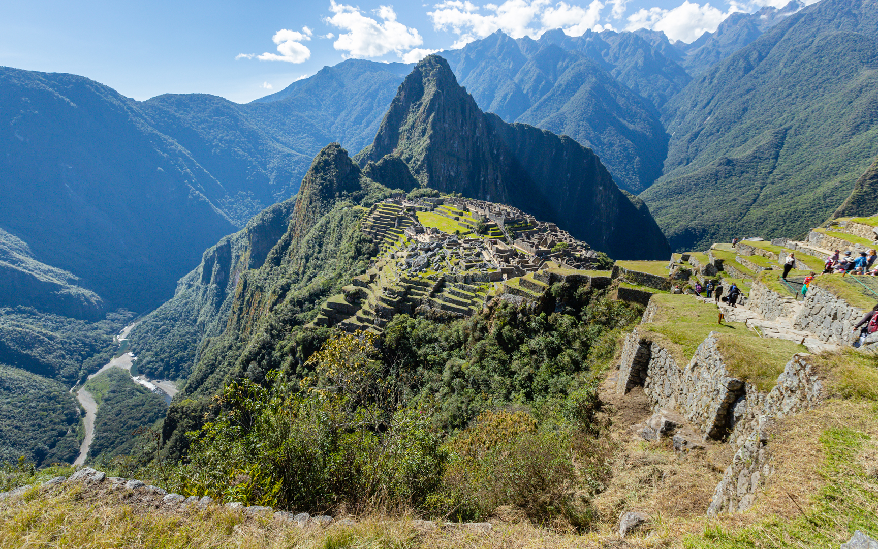 Délre értünk az Aguas Cualientesi szállásunkra. A város egy szűk, talán 50 méter széles szorosban fekszik, 600 méteres, szinte sima gránitfalak között, amelyek mögött kétezer méternyit megnövő hegycsúcsok bújnak meg. Itt szinte soha nem süt a nap. Az Urubamba rohanó vize óriási, több méteres, legömbölyített sziklák közt bukdácsol hangos dohogással. Egy gyors szendvicses ebéd után buszra szálltunk, hogy feljussunk a hőn áhított Machu Picchu hegy tetején álló inkakori település bejáratához. Na de honnan van itt busz, ha nincs út, amin bejöjjenek. Természetesen vonaton érkeztek. A számukra kiépített út a vasútállomástól a 600 méterrel magasabban fekvő másik végállomás között van. Ezen a csupa szerpentin úton zötyögtünk fölfelé az Urubambától a szinte csak hajtűkanyarokból álló murvás úton. Az előbb még fölénk tornyosuló, cukorsüveg alakú hegyekre lassan fölülről néztünk le. Az elképesztően tagolt felületű hegység meredek lejtőit burjánzó zöld növényzet takarta. 20 peres kapaszkodást követően megérkeztünk meg a modernkori 7 építészeti csoda talán legismertebbjéhez.