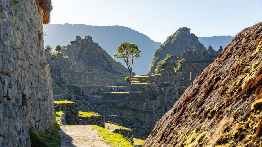 A városhoz annak idején kövezett gyalogúton lehetett eljutni, amely részét képezte annak a 40 ezer kilométeres hálózatnak, amely átszelte az egész hatalmas Inka Birodalmat, a hegyektől a tengerpartig. A „naputak” (nan cuna) általában 4-6 méter szélesek voltak, és két oldalukon fal húzódott, ám Machu Picchu esetében szándékosan nehezen járható nyomvonalat jelöltek ki, amelynek több pontjáról is félelmetes szakadék tárul az ember szeme elé. Ennek részben a nehezebb megközelíthetőség, részben pedig egyféle áldozathozatal, lelki megtisztulás volt a célja. Aki az zarándokút végén a Napkapun beléphetett, annak elállt a szava a látványtól, mint annak idején nekem is. A Napkapu egy 5 méter magas, egy méter vastag kőfal. A falból nyíló nagy, egyetlen tömbből faragott álló kapun keresztül lehetett bejutni a városba, a mezőgazdasági célokra használt teraszok között. A kaput csapok, fatörzsek és reteszek segítségével csak belülről lehetett zárni. Az ösvény a városon túl, az Amazonas vidékig folytatódott. A sziklafalakba rögzített kőlapokból álló úton csak libasorban lehetett járni. A településhez közeli szakaszon egy függőhídon kellett áthaladni. Ez egyértelműen jelzi, hogy a városlakók számára a biztonság elsődleges szempont volt. A város építőanyagául szolgáló gránitot, az innen egy kilométerre fekvő kőfejtőben, illetve helyben, a város közepén bányászták, és részben ott is munkálták meg. Egyes tömbök több tonnát nyomnak, de olyan tökéletesen csiszolták le őket, hogy az összeillesztésüknél nem volt szükség kötőanyagra. A falfelületeken szabálytalan kötéshálózat alakult ki. A tömbök ritmusa, a kőosztás ad némi változatosságot, ez jelenti egyben a stabilizálást és a díszítőelemet. Egyedi, hogy nincsenek sormagasságok, nem minden él függőleges, vagy vízszintes, és előfordulnak negatív sarkok. Mai ésszel ez ellentmond a gyors és tervezhető kivitelezésnek.