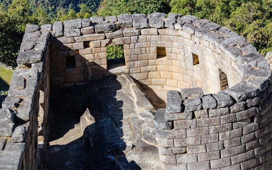 A „Szent tér”-nek nevezett tisztásról 60 lépcsőfok vezet fel a fellegvár legmagasabb és legszentebb pontjához, az Intihuatanához, ahhoz a helyhez, ahová a téli napforduló napján ünnepélyes szertatás kíséretében szimbolikusan kipányvázták a Napot, hogy biztosítsák az égitest visszatérését. A hegycsúcs gránitszikláját faragással és csiszolással oltárrá alakítottak. Az oltár talapzatán 36 cm magas, keskeny oszlopféleség áll, amelyet napóraként használtak. Árnyéka segítségével határozták meg az évszakokat és a hónapokat. A Főtér közelében két fontos épület áll. A Naptemplom félkör alaprajzú, kétszintes torony, közepén egyetlen kőtömbből álló oltárral. Az oltár tetején van egy mélyedés, amelyet a nyári napforduló felkelő napja világít meg. Feltételezetten ezen a helyen is csillagászati megfigyelések és rituális áldozatok zajlottak.