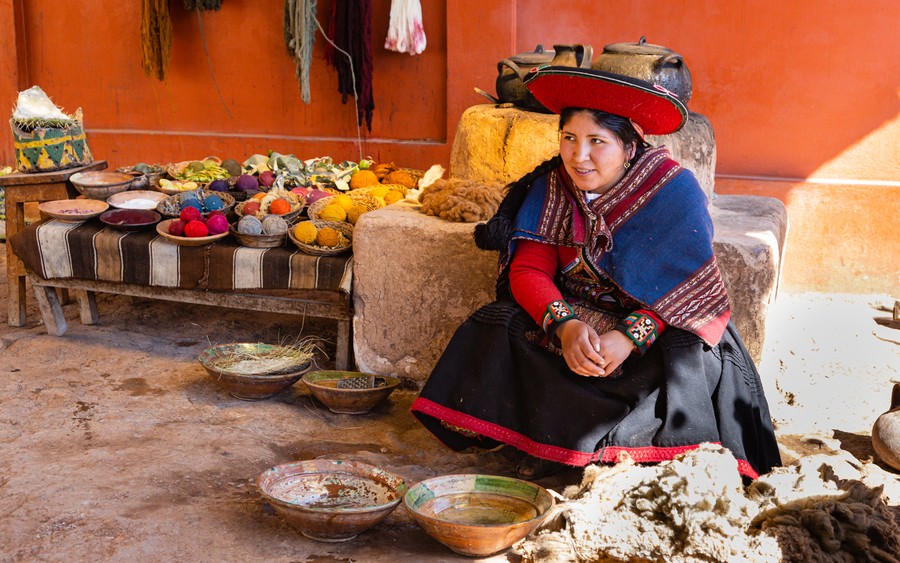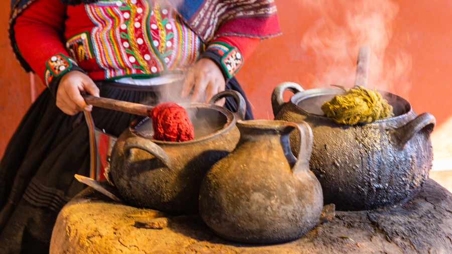Cuscohoz közeledve megálltunk egy kis faluban, Chinceroban. A település arról híres, hogy itt készítik a legjobb minőségű kötöttárut alpakából. Meglátogattunk egy közösségi házat, ahol megnézhettük, hogyan készülnek a termékek, és a színpompás kínálatból vásárolhattunk is. A gyapjúból először agy növény lereszelt gyökerének oldatával fehérre mossák. Ezután kifésülik a szálakat, amiket egy kézi orsó segítségével fonallá sodornak. A kész fonalkötegeket ekkor színezik be természetes festékekkel, amik növényekből és ásványok, porából, a vörös szín pedig a kaktuszokon tenyésző bíbortetűből készül. A festékeket meleg vízben oldják föl, és a fonalakt abban főzik. A szín mélysége a főzés idejétől függ. A szövést hagyományosan készítik. A színes vetülékszálak egyik végét egy stabil ponthoz, a másikat pedig a derekukhoz kötik. A folyamat innentől ismerős, a szövőszálat a mintának megfelelően felszedett vetülékszálak között átvezetik, végül soronként egy csonttal szorosra ütögetik.