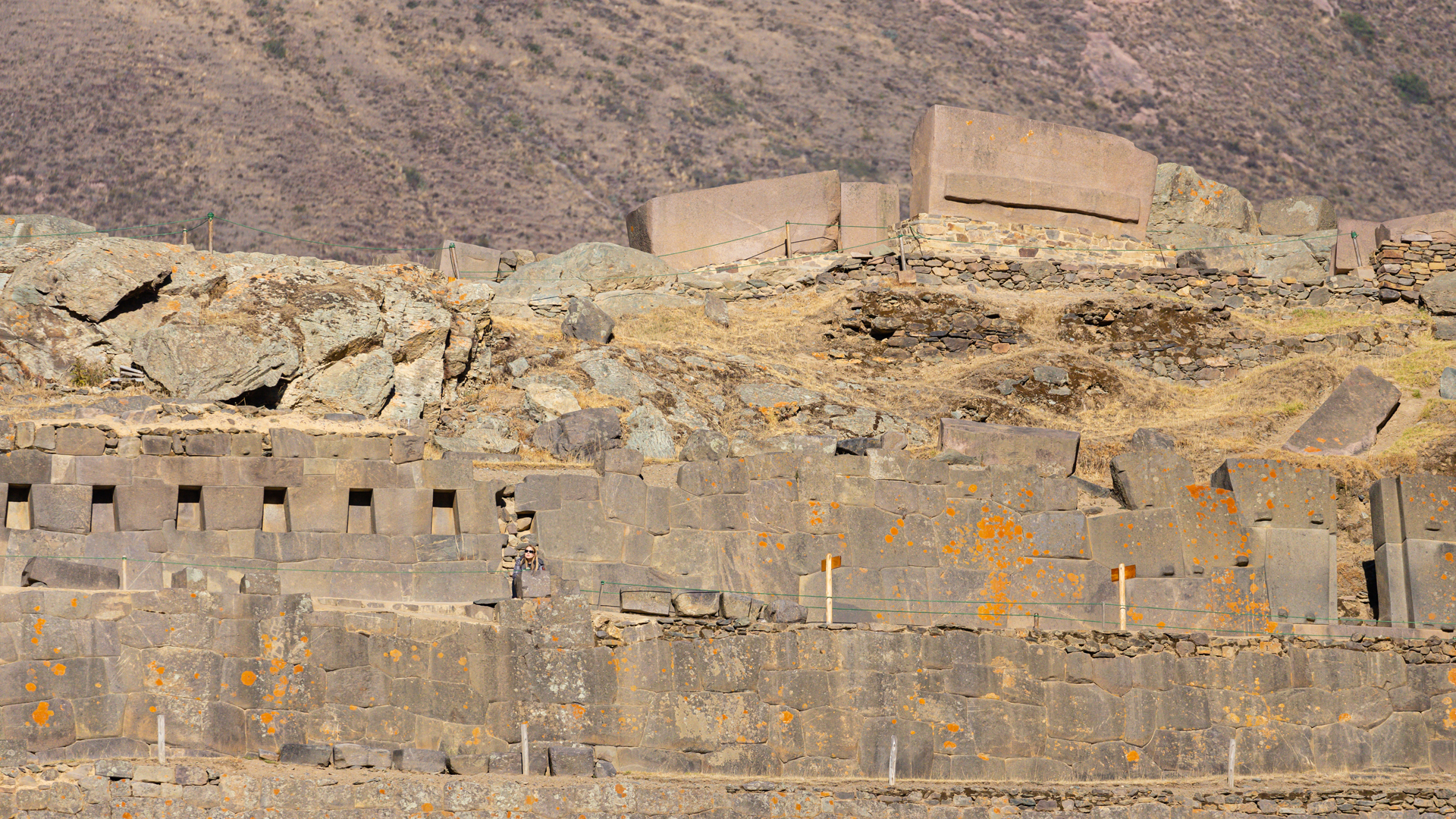 Az erőd alsó szintje a folyóparti várossal egy szinten helyezkedik el. Ezen a területen találhatók a fürdők, a naptárkő és a főleg vályogból készült házak. Láttunk meditációs helyeket, illetve olyan kialakítású kőelemeket, amelyek mesterien megmunkáltak voltak, de szétszórva hevertek. E fölött magasodtak a nem túl nagy, de annál meredekebben megépített teraszok. A Naptemplomot a várdomb legmagasabb, és egyben legkitettebb pontjára építették. Innen látható mindkét irányból a naplemente, viszont itt a szél is állandó. Éppen ezért ezt a szelek templomának is nevezik. Gyönyörű, mesterien megmunkált falak mellett lehet feljutni az kicsi „Szentély térre”, ami az inka építészet csúcspontját képviseli. Óriási, tökéletesen megmunkált vörös gránittömbök állnak egymás mellett, amelyeken andesi kereszt, és egyéb ábrázolások voltak, amelyet a spanyolok pogány istenimádásra hivatkozva eltávolítottak onnan. Az épületek még építés alatt voltak, amikor a spanyol sereg elfoglalta a várost. Emiatt az épületek itt sem lettek befejezve. Mindenfelé félig megmunkált kőtömbök hevertek. Nem csupán a Naptemplomban, hanem a városban, sőt a bányáig vezető 5 kilométeres út mentén is. A bánya az Urubamba túloldalán volt, ahol mintegy négyszáz kibányászott, és elszállításra váró gránittömb hever. Ezeket nagyjából már itt megmunkálták. A templom környékén heverő soktonnás köveken is jól látszódott az előkészítés, némelyiken hosszanti kidomborodás futott, másokon öklömnyi púpok voltak. Láttunk T alakú bevéséseket, amik a tömbök összekapcsolására szolgált. A kapcsok anyaga rézből, ezüstből és aranyból készített ötvözet volt, amit megolvasztva öntöttek az üregekbe.