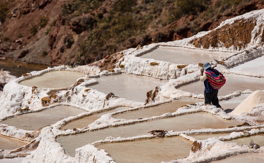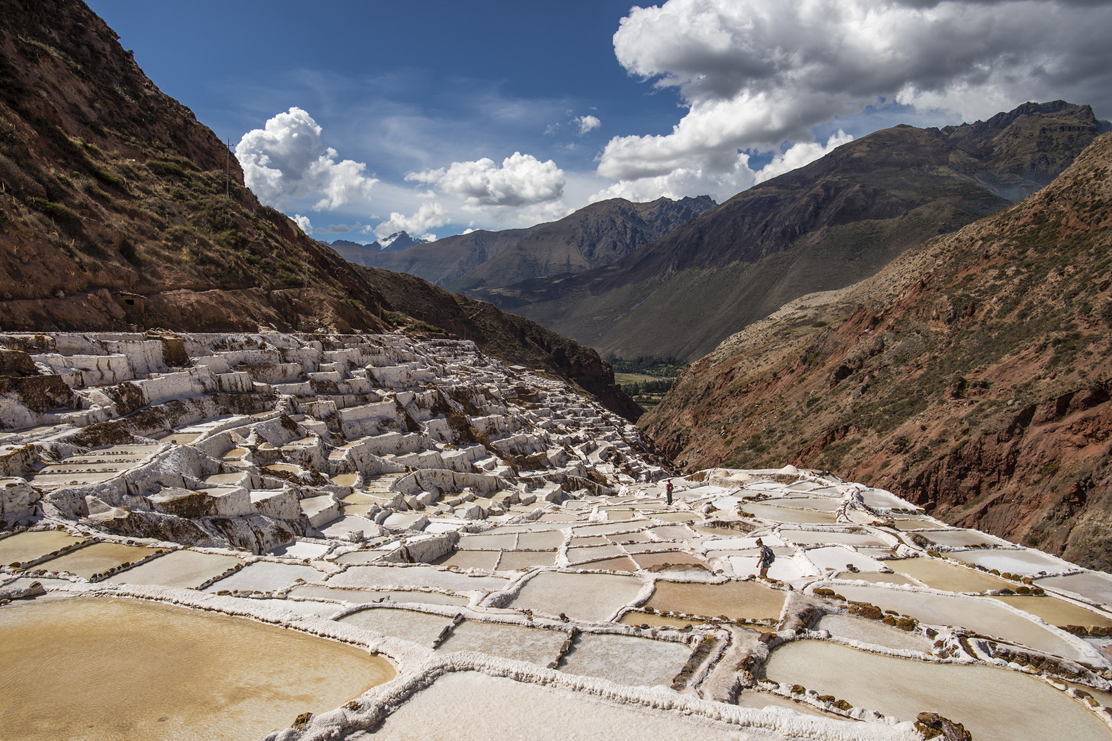 A magashegyi platóról csak keveset ereszkedtünk lefelé, amikor elértük a koloniális stílusban épített Moray városát. A keskeny utcákon kétszintes, többnyire fehérre festett házak sorakoztak apró erkélyekkel, és kőből faragott kapukeretekkel. Éppen esküvőt tartottak a főtéren, ahol a tér szélén lacikonyhát működtettek. Frissen készült csicsát (hagyományosan megrágott kukoricából, ma már inkább édesburgonya hozzáadásával készült sört) árultak, mellé főtt húst kínáltak. A rövid városnézést követően Maras felé vettük az irányt. A hegy belsejéből emberemlékezet óta negyvenfokos, magas sótartalmú víz fakad, ami egyrészt a tengerfenék kiemelkedésének, és a közben visszamaradó sórétegnek, másrészt a Nacsa-lemez alá bukó Pacifikus-lemez által generált vulkanikus tevékenységnek a közös utóhatása. Már több ezer évvel ezelőtt elkezdték kialakítani az a háromezer teraszt, ahová felváltva vezetik a forrásvizet. A magashegyi alacsony légnyomás, a száraz levegő és az állandó szél együttes hatásának következtében gyorsan párolgó víz finom sórétegeket hagy maga után. Az újabb és újabb vízfeltöltés végeredménye a Világ leg magasabb minőségű étkezési sója. Már távolról is érdekes látványt nyújtott a lepárlótelep. Egy keskeny völgy meredek, vörösesbarna oldalán fehéres foltként világlott ki a terület. Közelebbről megnézve azonban a lépcsőként támaszkodtak egymásra a hófehértől okker színig változó apró tavacskák. A színeltérés a lepárlás megkezdésének idejétől függ. Először a talajjal érintkező barnásabb, szennyezettebb sóréteg ülepedik le. Ezt állati takarmányozásra használják. Ahogy nő a vastagság, tisztul és fehéredik a visszamaradó végtermék. A szürkésebbet az általános háztartásbeli felhasználásra, a hófehéret a felsőkategóriás éttermeknek szállítják.