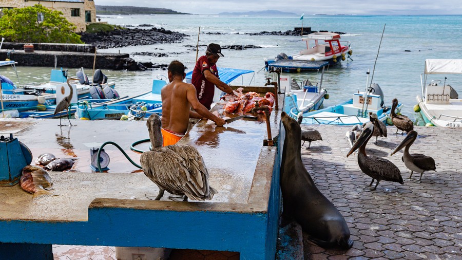 Ez a régi kikötő a turisták igényeinek kiszolgálása érdekében egy néhány utcás sétánnyá alakult boltocskákkal és éttermekkel. Ami az igazán meglepő volt, hogy a legkülönfélébb madarak sétáltak a parton, fókák lustálkodtak a padok között, és tengeri leguánok melegedtek a part járdán. Ránk sem hederítettek, csak a fókák vakkantottak mérgesen, ha egy méternél közelebb mentek hozzájuk. Elsétáltunk a Darwin központig, ahol a begyűjtött teknőstojásokból segítenek felnevelni a következő nemzedéket. Vacsorára egy parti étteremben halas-rákos ételt fogyasztottunk, és megkóstoltuk hozzá a helyi termesztésű, erős pörkölésű, savanykás kávét. Ha felfogni még nem is tudtuk, most már elkezdtük megélni ezt az elképesztő világot.