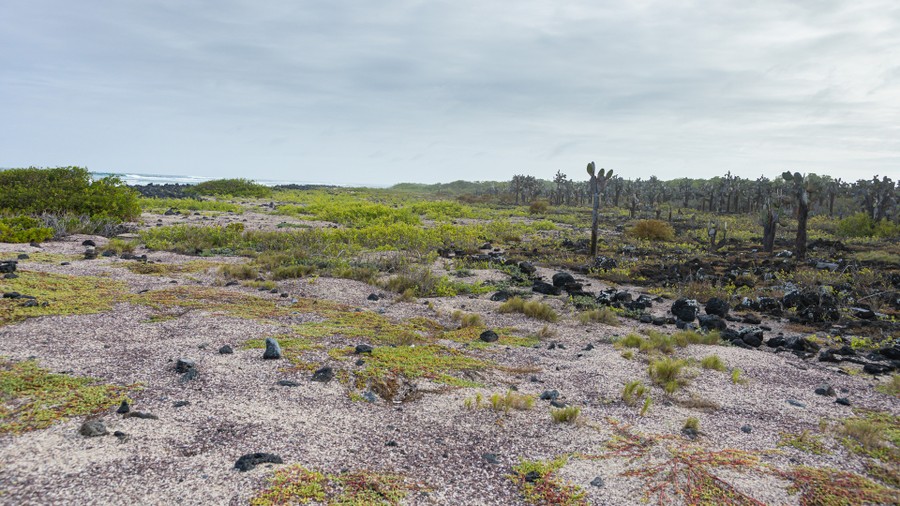 A Baltra-szigeti reptérre 3,5 óra alatt jutottunk el egy közbenső leszállással. A szigetekre a belépés szigorúan ellenőrzött. A 120 USD-s belépési díj befizetése után a csomagok kutyás és kézi átvizsgálásos ellenőrzése következett, nehogy bármilyen szerves eredetű anyag, főleg növényi mag, vagy állat bekerüljön a szigetekre. Ez régebben óriási gondot okozott, mert a tehenek, kecskék, macskák, kutyák óriási pusztítást végeztek. Mára ezeket szó szerint levadászták, csupán a patkány maradt kiirthatatlanul. A reptérről 10 perc alatt elértünk egy kompkikötőhöz. Út közben rácsodálkozhattunk a terméketlen vulkanikus kőzetek lyukacsos, vörösesbarna tengerére, amelyen a minimális termőréteg is csak elvétve fordult elő. Ennek ellenére görbe, fehér törzsű fák kapaszkodtak ebbe az életet adó talajba. Száraz évszak lévén inkább tűntek csontvázaknak, mivel leveleiket lehullatták. Az aprócska hajóval pár perc alatt átjutottunk a 300 méter széles Itacaba-csatornán a Santa Cruz-sziget északi oldalára. Ott ismét buszra szálltunk, és elindultunk a sziget déli oldalára, Puerto Ayora városka felé. Az ősidők óta itt szolgáló vén buszunk nyögve vonszolt föl minket a sziget majd 1,000 méterre kimagasló felföldi részére.