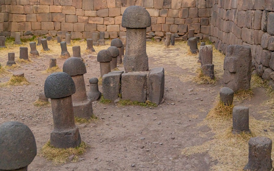 A tó partján még egy kicsit gurultunk dél felé, még végül a nyolc óra alatt megtett 420 kilométer után megérkeztünk Chuquitoba. A szállás elfoglalása után felsétáltunk a Tiwanaku kultúra idején, nagyjából háromezer éve épített Termékenység templomához, pontosabban annak maradványához, ahol a terméketlen párok számára ma is tartanak a sámánok szertartásokat. Az inkákat jóval megelőző civilizáció már ismerte a kőmegmunkálás fortélyait. A fal kétrétegű volt. A belső eléggé elnagyoltan volt megmunkálva és összerakva, de a külső, nagy tömbökből precízen összeállított fal ámulatba ejtő volt. Vonalai hullámosabbak voltak, mint amilyeneket Cuscoban láttunk, és a felülete kevésbé volt hullámos, az egész egy síkba volt stokkolva. A nagyjából négyezer éves épület előtt ismét döbbenten álltunk. azt is nehéz lett volna elképzelni, hogy tegnap készült a mesteri alkotás, de kőkori technológiákkal teljességgel lehetetlennek tűnt. Ma ilyet csak egészen komoly technikai apparátussal tudnánk talán megalkotni, rendkívül magas költségekkel. A templom belsejében tucatszám sorakoztak a kőből faragott fallosz szobrok, a legnagyobb másfél méteres volt.
