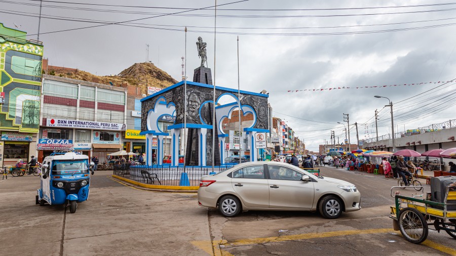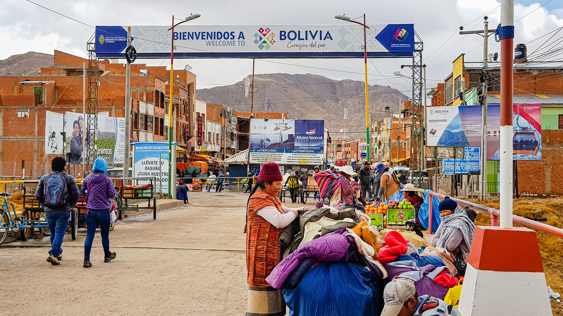 Háromórányi utazást követően értünk a Bolíviai határra, Desaguaderoba. Tarka tömeg, riksák, árusok és autók. Kocsival itt nem lehet átlépni, csak gyalog. Egy keskeny folyócska a határ, amin csomagokat cipelő emberek, kézikocsik és riksák vonultak keresztül mindkét irányba. A perui oldalon az egyik épület földszintjén tartottak egy gyors útlevél ellenőrzést. Ezután váltottunk némi bilíviai szolt, és csatlakoztunk a vonuló tömeghez. Ahogy átértünk a hídon, azonnal megcsapta az orrom a romlás savanyú szaga. Kétoldalt boltok sorakoztak, de jóval kevesebb volt az ember és a jármű. Bementünk a határőr állomás apró, sötét épületébe, ahol pillanatok alatt készítettek rólunk egy fényképet, pecsételtek egyet az útlevélbe, és máris Bolíviában voltunk. Mivel a miénk nem jöhetett át, egy másik mikrobuszba szálltunk, és már mentünk is az áhított cél, Tiwanaku felé. A határvárosban még viszonylag modern épületek voltak, a fontosabbak előtt gépkarabélyos őrök strázsáltak. Az út jobb minőségű volt, de többször megállítottak talpig fegyverbe öltözött katonai egységek, amelyek a csempészeket ellenőrizték.
