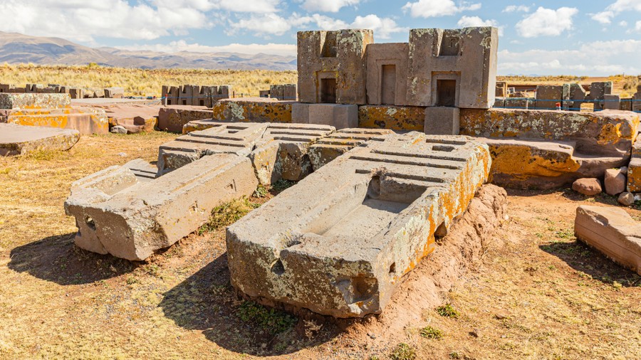Az ásatási területre belépve az út mindkét szélén egy jókora tölcsérszerűen kifúrt kocka alakú kőtömb állt, amelybe beleszólva a hang felerősödve zengte be a környéket. Tökéletes megafonok voltak. Az épületcsoport legmesszebbről látható tagja az Akapana piramis. Neve kiválasztó helyet jelent, de hogy kit, és hogyan választottak ki, arról fogalmunk sincs. A piramis nagyjából 150*150méteres alapterületű csakana-kereszt alaprajzú, hétszintes, nagyjából 20 méter magas, kőből készült építmény volt. Tetején szintén csakana kereszt alakú mélyedés volt, amelyet vízzel töltöttek föl, és az eget az abban keletkező tükörkép alapján vizsgálták. A belsejében járatokat alakítottak ki, amelyek bonyolult hálózatot alkotva, egészen a tóig vezettek.