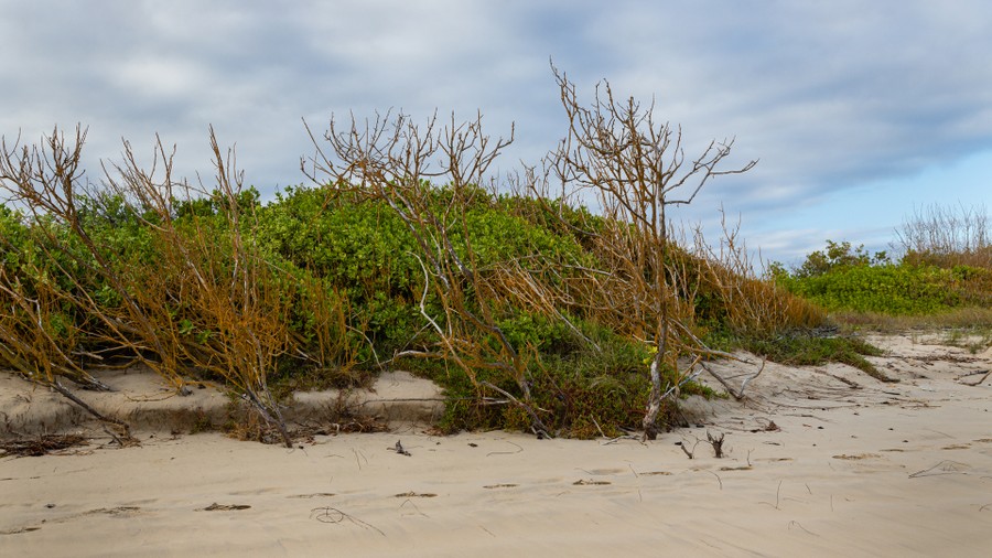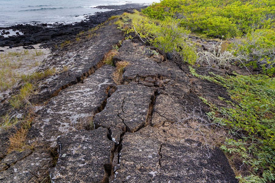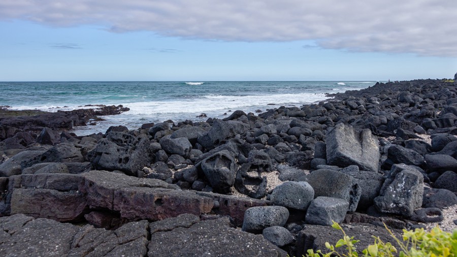 A neveldéből a tengerpart felé vettük az utunkat. A parthoz közeledve mangrove erdőn sétáltunk át. A kisebb lagúnákban flamingókat, vadkacsákat és fókákat láttunk a vízben, a fák ágain pedig pelikánok pihentek. A tengerparton csodás látvány fogadott. A sima, bársonyszerű homokfövenyből helyenként méternyi magas, koromfekete, szabálytalan formájú, éles sziklahalmok emelkedte ki. Közelebb érve úgy tűnt, mintha az egész fekete massza mozogna. Néhol apró vízsugarak lövelltek ki belőle. Csak közelebb érve lehetett kivenni a megannyi tengeri leguánt, amelyek a napon sütkérezve próbáltak átmelegedni egy újabb legelészés előtt. Ezeknek az állatoknak a rokonai mind a szárazföldi növényekből táplálkoznak, az itt megtelepedett egyedek azonban ilyen tápanyag forrás hiányában kénytelenek voltak rászokni a tengeri alga fogyasztására, amelyért viszont a háborgó, hideg tengervízbe kell merülniük. Hüllő lévén testük gyorsan kihűl, csak negyed órát tartózkodhatnak a hideg tengeri áramlatok miatt csupán 12 fokos vízben, amibe azokat a küzdelmes perceket is bele kell számolni, amikor már gémberedő izmaikkal megpróbálnak kikapaszkodni a sziklákra az erős hullámverésben. Az átmelegedett köveken aztán a nap forró sugarait is felhasználva órákon át sütkéreznek.