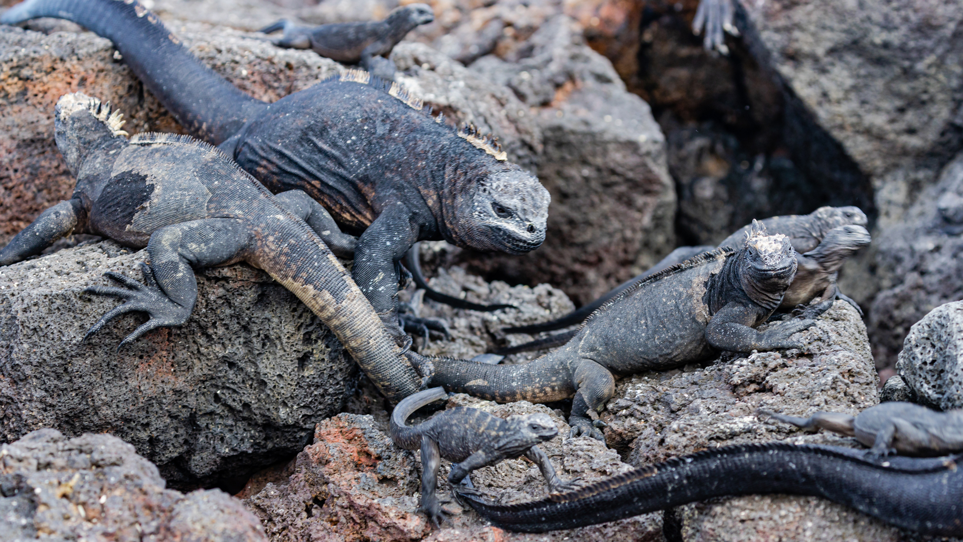 Rengetegen vannak, ezért állandóan lökdösik egymást, de ha mozdulatlanok maradtak, alig lehetett észrevenni őket. Nagy csatározásokat nem láttam ugyan, de azért állandóan nyüzsögtek, és átmásztak egymáson. Időnként fehér vízsugarat lövelltek ki az orrnyílásukon, ezzel távolítva el testükből a fölösleges sótartalmat. A hímek a hátukon meredező tüskéikkel, pikkelyes bőrükkel, marcona pofájukkal és antracit színükkel igazi godzillák voltak törpe kivitelben. Kisebbek voltak, mint gondoltam. A legnagyobbak sem voltak sokkal hosszabbak egy métertől, aminek a leguánok közt egyedülálló módon nagyjából a fele farok. Ennek a segítségével úsznak, és a gyíkoktól eltérően nem nő ki újból, ha elveszítik. A nagy többség 1-2 arasznyi volt csupán. Nagyobb korukban nincs természetes ellenségük, de ebben a méretben még óvatosnak kell lenniük, hiszen a fregattmadarak elkaphatják őket. Azok sem tudják elfogyasztani őket könnyen, a magasból a sziklára ejtve először meg kell ölniük a kis leguánokat, mert karmaikkal komoly sérüléseket okozhatnak. Nincsenek teljesen egyedül. Apróbb hüllőtársaik, a sziklagyíkok szorgoskodnak körülöttük. Vedlő bőrük foszlányait csipegetik róluk.