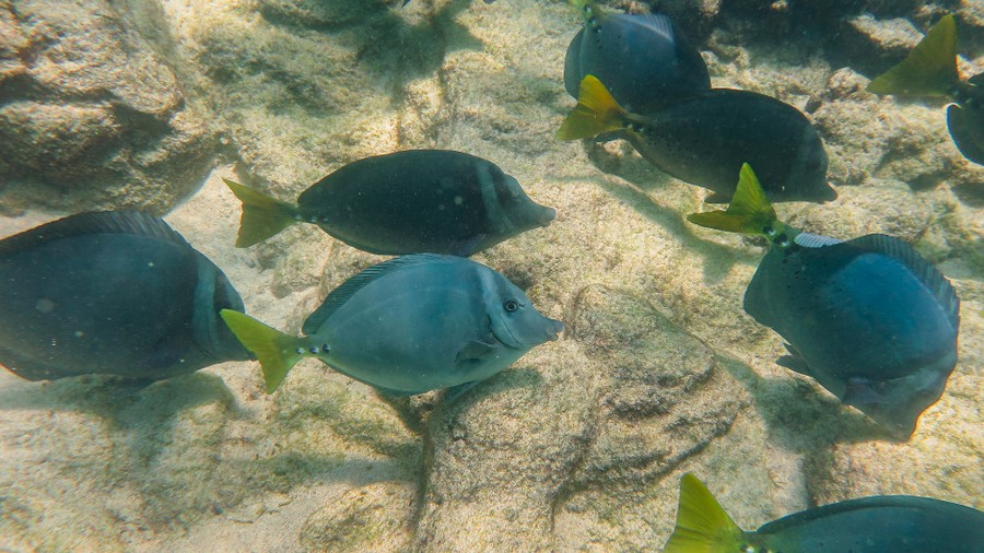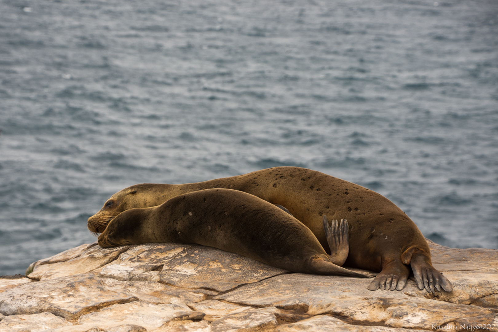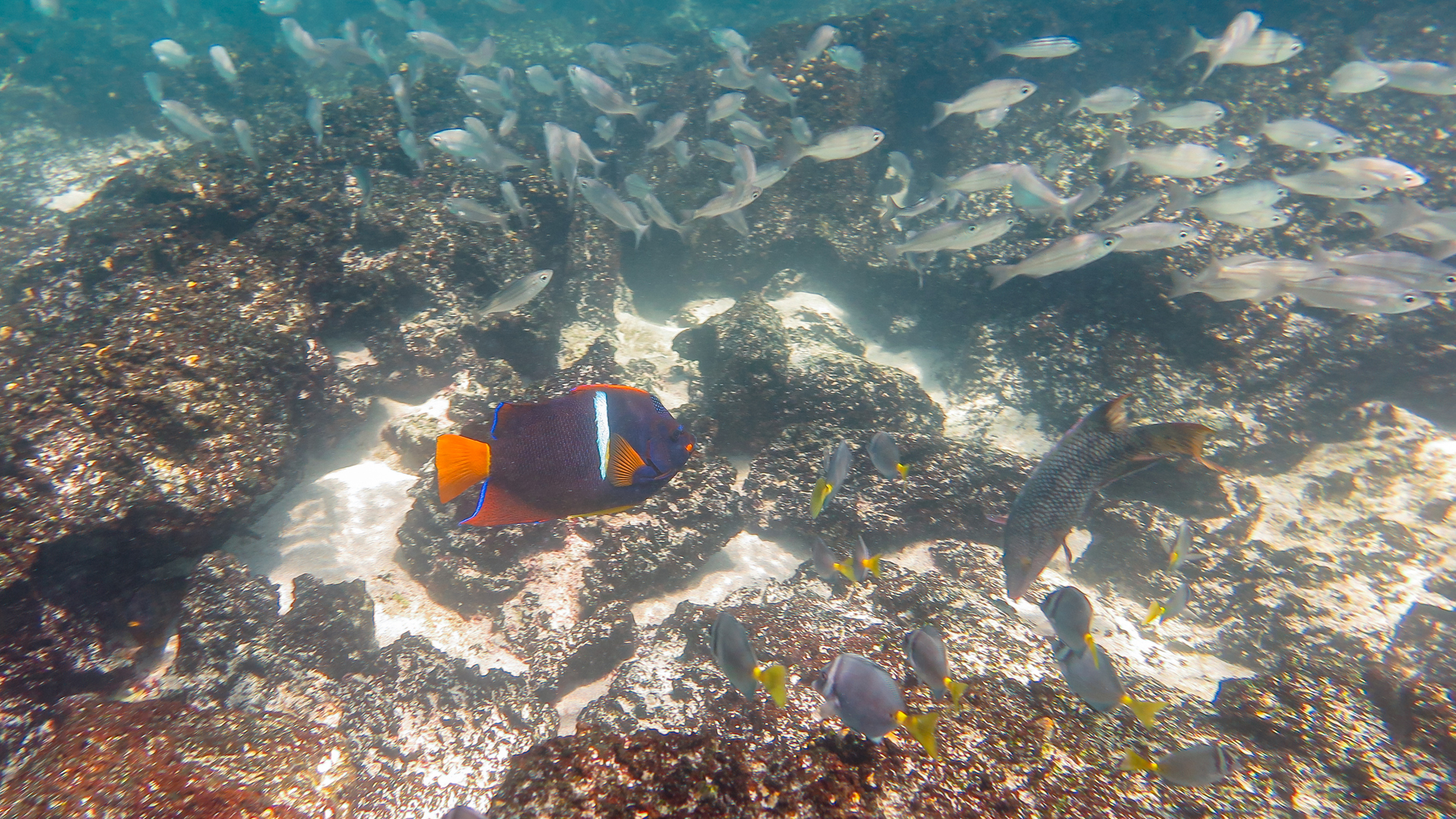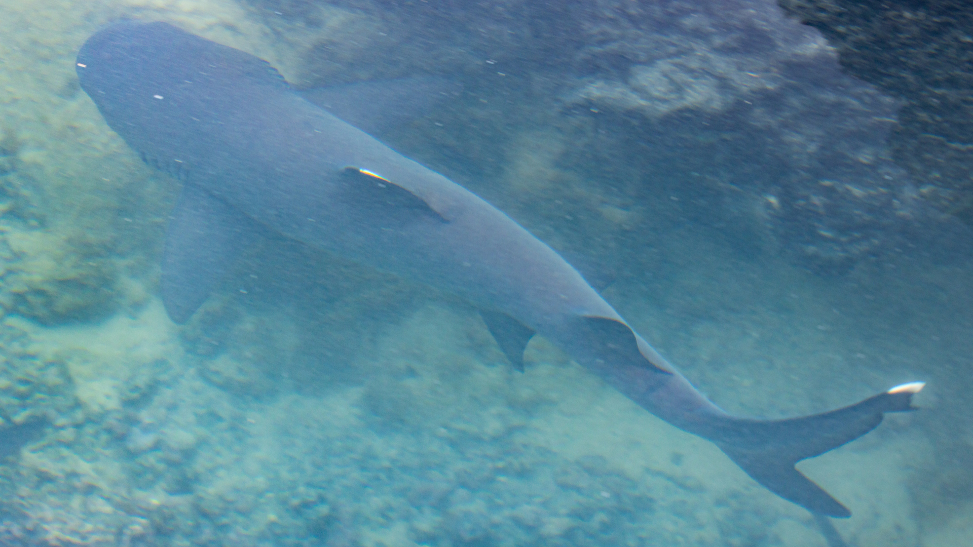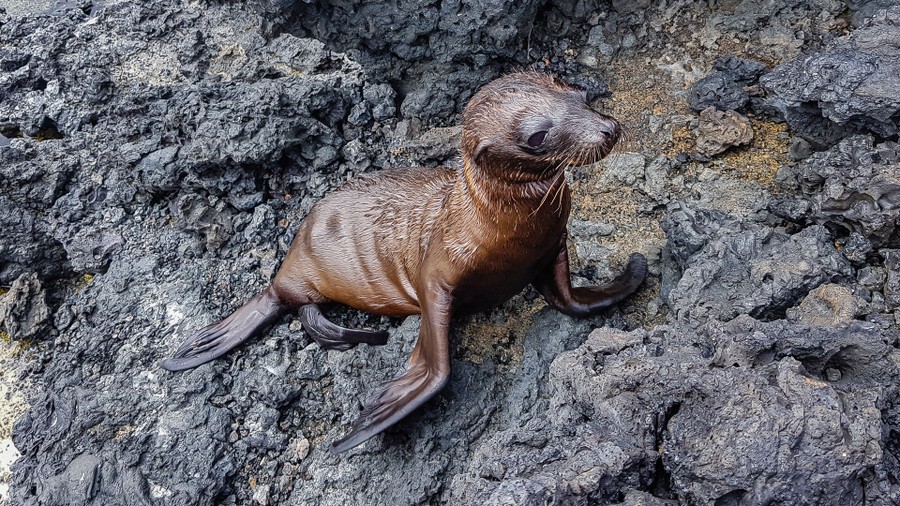 Az egyik keskeny kis csatornában egy csapat fiatal szirtcápát láttunk meg. A másfél méteres példányok az áramló 1 méter mély vízben pihentek, így spórolva energiát. A cápáknak ugyanis nincsenek kopoltyúfedőik, amivel az oxigéndús vizet a kopoltyújukhoz juttathatják, hanem állandóan úszniuk kell, vagy áramlásban kell tartózkodniuk, nehogy elpusztuljanak. Nyugalmukat csak egy itt élő galápagosi prémfóka zavarta meg, amely minduntalan visszaúszott közéjük. Amiről ekkor még azt hittük játék, később kiderült, hogy véresen komoly anyai ösztön, mert mindezt apró kölyke védelmében tette, amely pár méterre, a part szélén próbált az éles sziklák között arrébb mászni. A félméteres fókabébi cuki pofáját forgatva, hangtalanul próbált keresni valami átjárót, amelyen az anyja közelébe juthat.