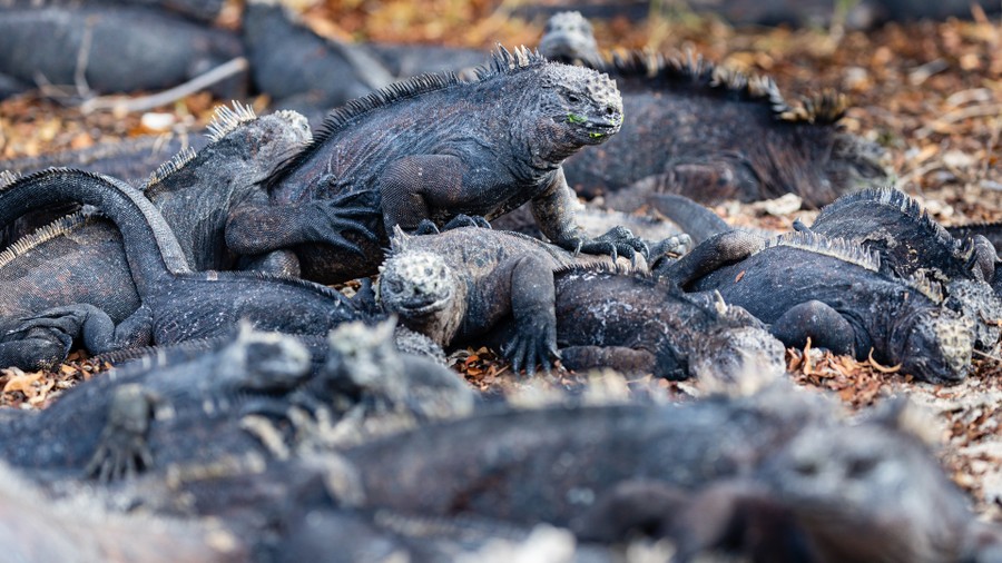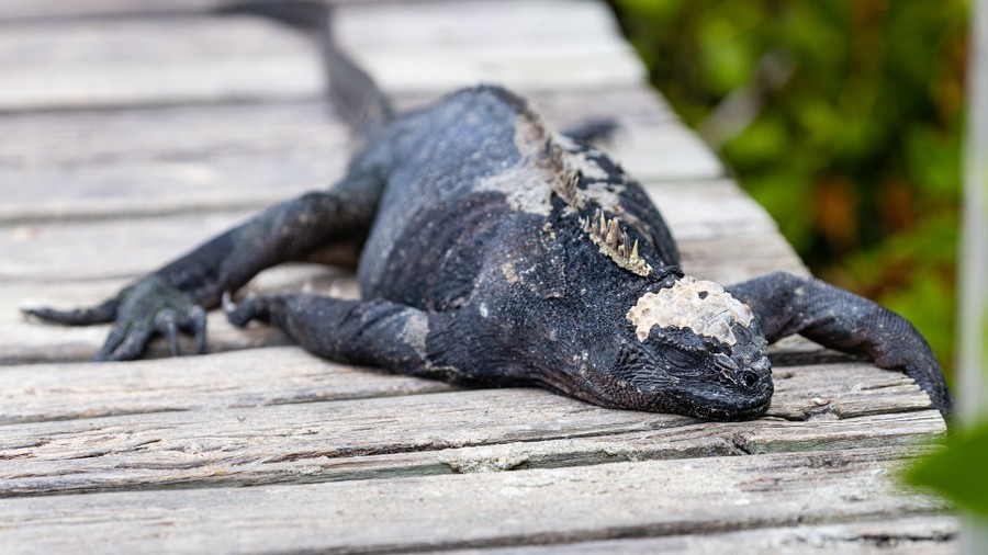 Egy rövid sétára partra szálltunk a kis szigeten. A fekete, tarajos felszínt a madárguánó fehér foltjai színesítették. A halaknak ez a végső formája erős bűzt árasztott, de a parttól távolabb már nem volt érzékelhető. A holdbéli tájon kanyargó ösvényen tengeri leguánok tanyáztak. Olyan sokan voltak, hogy most már tényleg kezdtem elhinni a majd félmilliós populáció valóságosságát.