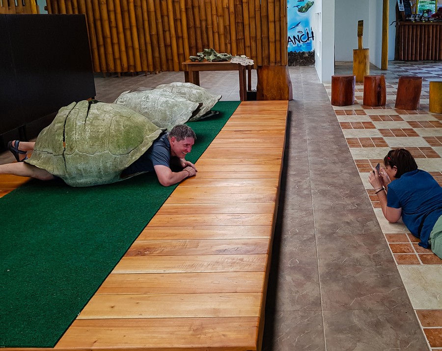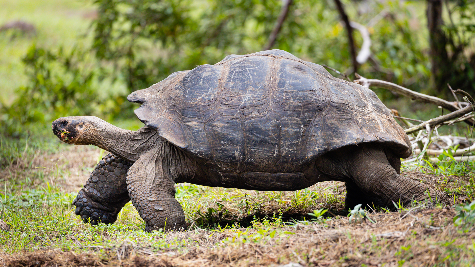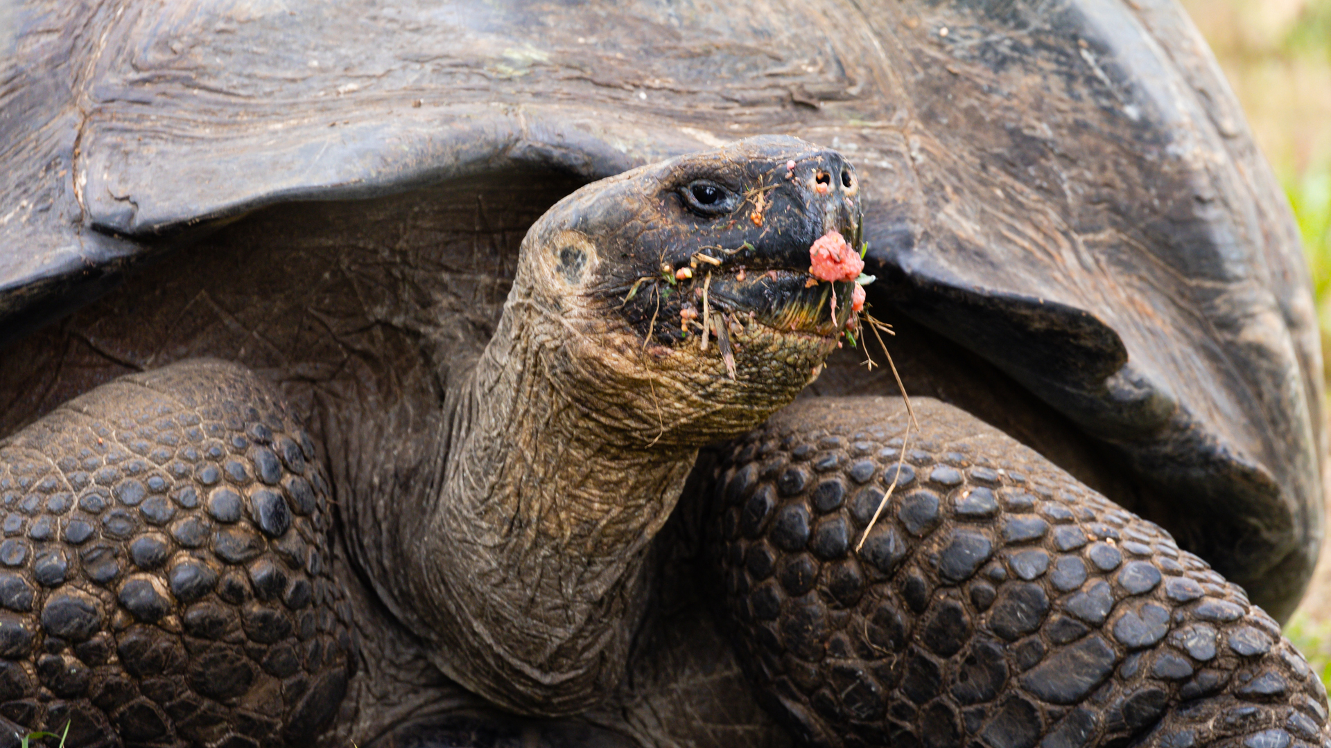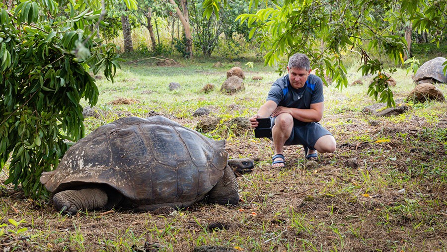 Egy árnyékot adó, Dél-Amerikából származó guapana fa alatt közelebb mentem az egyik óriáshoz, amely komótos mozdulatokkal falatozta a lepottyant, érett, piros belsejű, fügeszerű terméseket. A szája széle úgy ki volt kenve, mint egy csokit majszoló gyereknek. Letelepedtem tőle néhány méterre, és vártam. Az állat felbátorodott, és mivel nem mozdultam, egyre közelebb jött hozzám, és karnyújtásnyira legelészett mellettem. Zavarni sem akartam, meg azok fránya kis hangyák is nagyon csíptek, úgyhogy lassan kezdtünk kihátrálni a területről. Ahogy távolodtunk a békésen táplálkozó teknősnyájtól, olyan érzésem volt, mintha egy régi földtörténeti korból utaznék vissza mai világunkba.