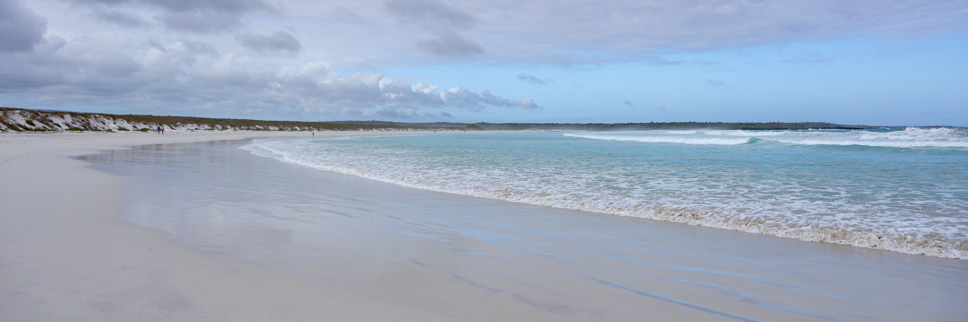 Az öbölhöz érve csodás látvány fogadott. hatalmas átbukó hullámok ostromolták a sárgahomokos, kilométernyi hosszúságú, lapos, íves partot. A szél vízcseppeket szakított le a hullámtarajokról, ezért úgy tűnt, mintha az egész vízfelszín ködben úszott volna. Mivel itt nem élnek korallok, a homok nem szerves eredetű, hanem a kontinens mállási folyamataiból származik. Fantasztikus érzés volt a süppedős finom homokban sétálni, miközben combközépig áztatott el néhány nagyobb, partot érő hullám. A víz hűvös, de kellemes volt. Halászmadarak keringtek a levegőben. A pelikánok és fregattmadarak nyílként csapódtak a vízbe egy-egy ízletes hal reményében. Az öböl végén tengeri leguánok csapata melengette testét a homokban, miközben időről-időre sós vízsugarakat fújtak ki az orrnyílásaikon. Picit arrébb újabb, az előzőtől kisebb, de talán még varázslatosabb öböl húzódott meg. Az egyik oldalon egészen a homokos partig húzódott le az erdő, a másikon leszakadt fekete sziklák meredeztek, amelyeken barna törzsű kaktuszok tenyésztek. A jóval nyugodtabb vízben fókák úszkáltak. A visszafelé vezető úton fáradtan, de élményekkel tele bandukoltunk a szállás felé.