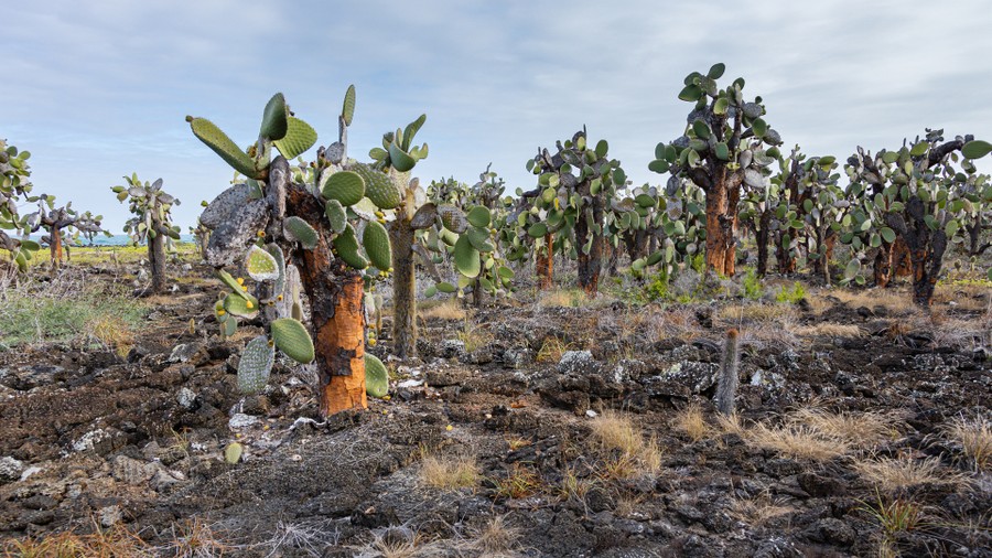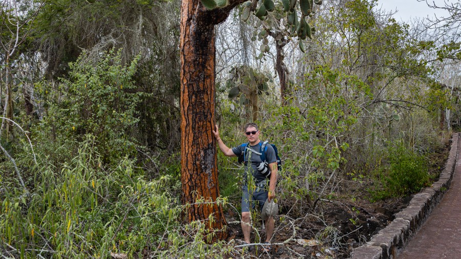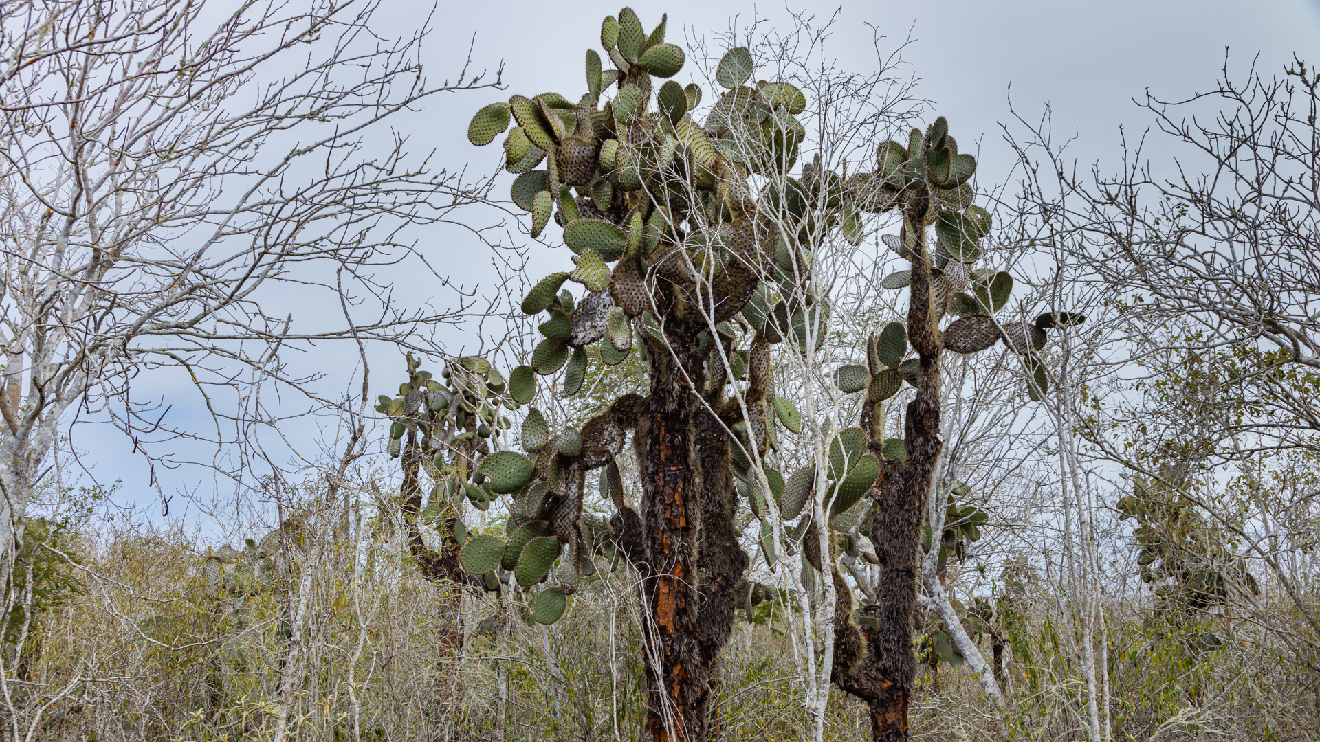 Volt még egy programunk, de addig képtelenek voltunk belevágni, ameddig felforrósodott testünket le nem hűtöttük a szálloda medencéjében. Pár perc üdítő pancsolást követően vettük a cókmókunkat, és elindultunk a 3 kilométerre fekvő Tortuga öbölhöz, amely a világ 10 legszebbje között szerepel. Az ég délutánra enyhén befelhősödött, de így is komoly megpróbáltatás volt a dombon átvezető út megtétele. A végig betonlapokkal burkolt ösvény kanyarogva vezetett át a sziget őshonos erdején. A kiépített út nélkül képtelenség lett volna itt átvágni. Már a talaj sem volt járható, éles, törmelékes sziklamező, amelyen mindenféle szúrós, tüskés növény élt kusza összevisszaságban. Legjelesebb képviselője a Galápagoszi kaktusz, amelynek tenyérnyi, ellaposodott szárai világosbarna, fél méter átmérőjű elfásodott törzsből nőnek ki. Levelei szúrós tövisekké alakultak a vízveszteség csökkentése céljából, magasságuk pedig elérhette a 10 métert. Ez az itteni tápláléklánc alapfaja, hiszen mind a teknősök, mind pedig a madarak egy részének a fő tápláléka. A teknősök a virágát, termését, de ínséges időkben még a szúrós ágait is falatozzák. Az úton állandóan madarak és apró gyíkok bukkantak föl, például a kaktuszpinty és a gezerigó.