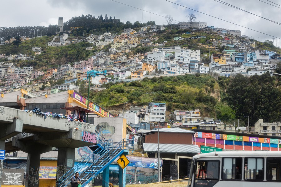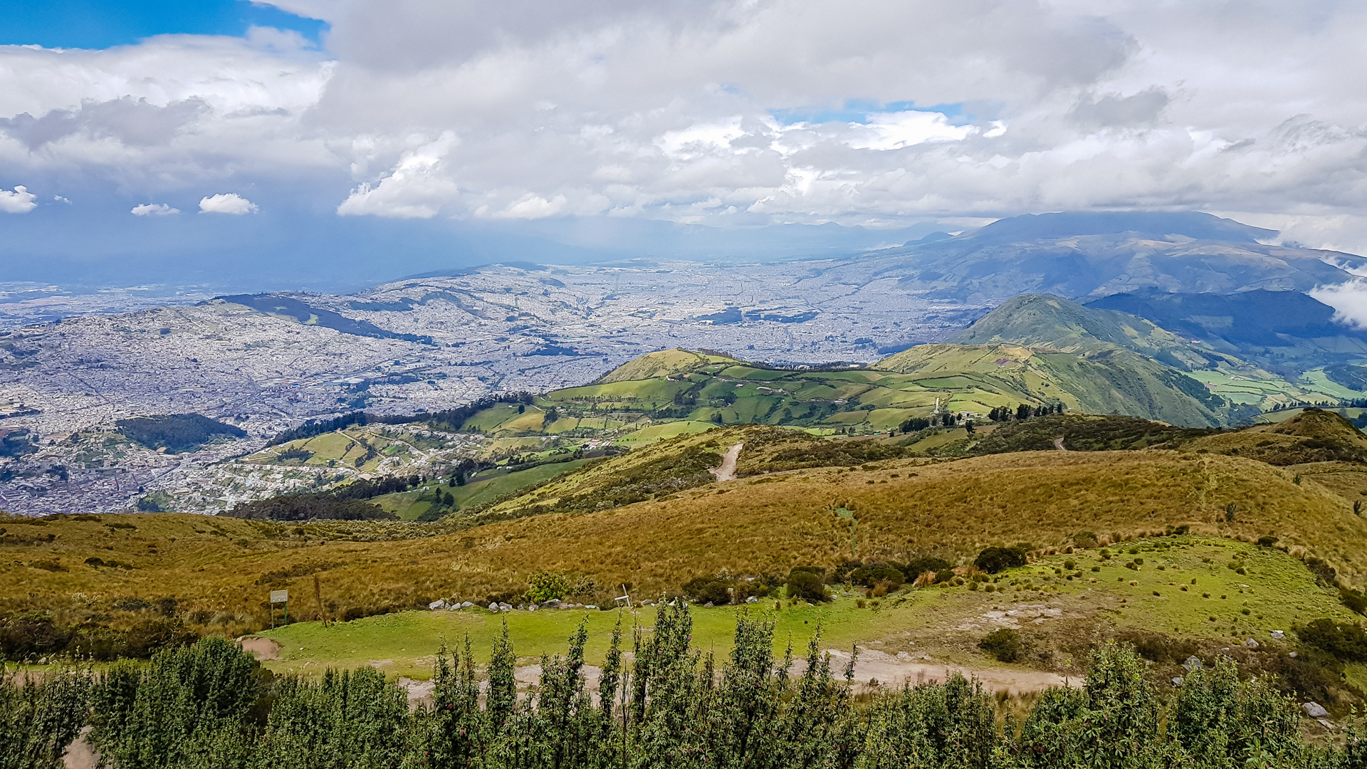 Ma egy újabb repülés várt ránk a szárazföld, Quito felé. Gyönyörű születésnapi ajándék volt a Galápagoson lenni, majd később azt fentről látni. A reptér felé vezető úton megálltunk a Santa Cruz-sziget tetején található Los Gemelos ikerkalderáknál. A meredek falú, 150 méter mély vulkáni kürtőkben már megtelepedett a növényzet, de még mindig jól érzékeltette a valaha itt munkálkodó óriási erőket. Gyorsan leereszkedtünk a sziget másik oldalán, áthajóztunk Baltrára, és ismét repültünk. A Quitoi leszállás során jól lehetett érzékelni a nyolcmilliós főváros nagyságát. A völgyből már a környező hegyoldalakra is fölkúszott a település, aminek meredek, keskeny utcái igazi labirintust alkotnak. Az autóforgalom óriási, de ilyen körülmények között nincs igazán más alternatíva a közlekedésre. Az itteni közlekedés felér egy hullámvasutazással. A város legérdekesebb járműve a trolinak nevezett busz. A név megtévesztő, mert nem árammal megy. Egy olyan busz, ami két helyen csuklik. Óriási mérete ellenére könnyedén fordul a szűk utcácskákban, erős motorjuk pedig könnyedén leküzdi a meredek emelkedőket. Felszállni úgy lehet rá, hogy egy rámpán kell felmenni a busz padlószintjének magasságába épített peronra, és onnan csak be kell lépni.