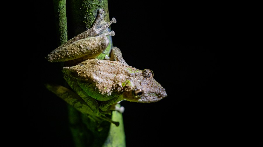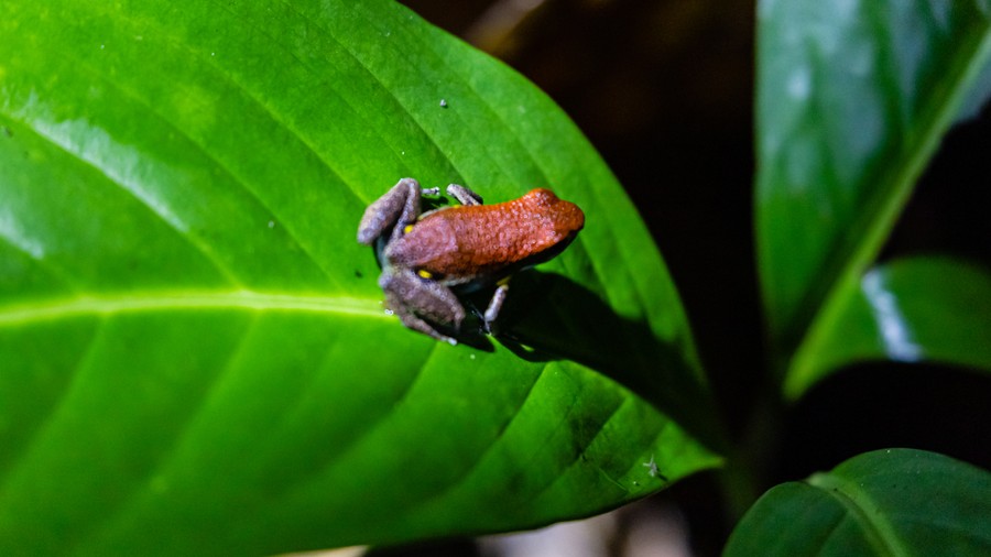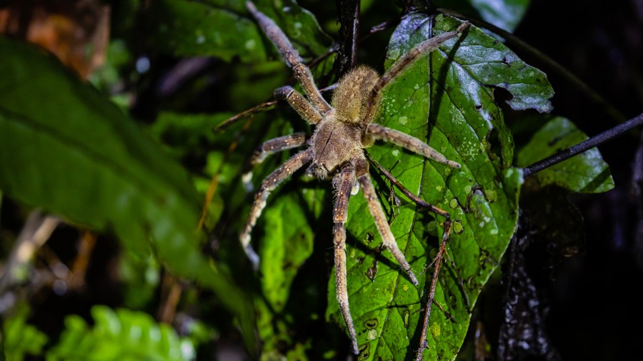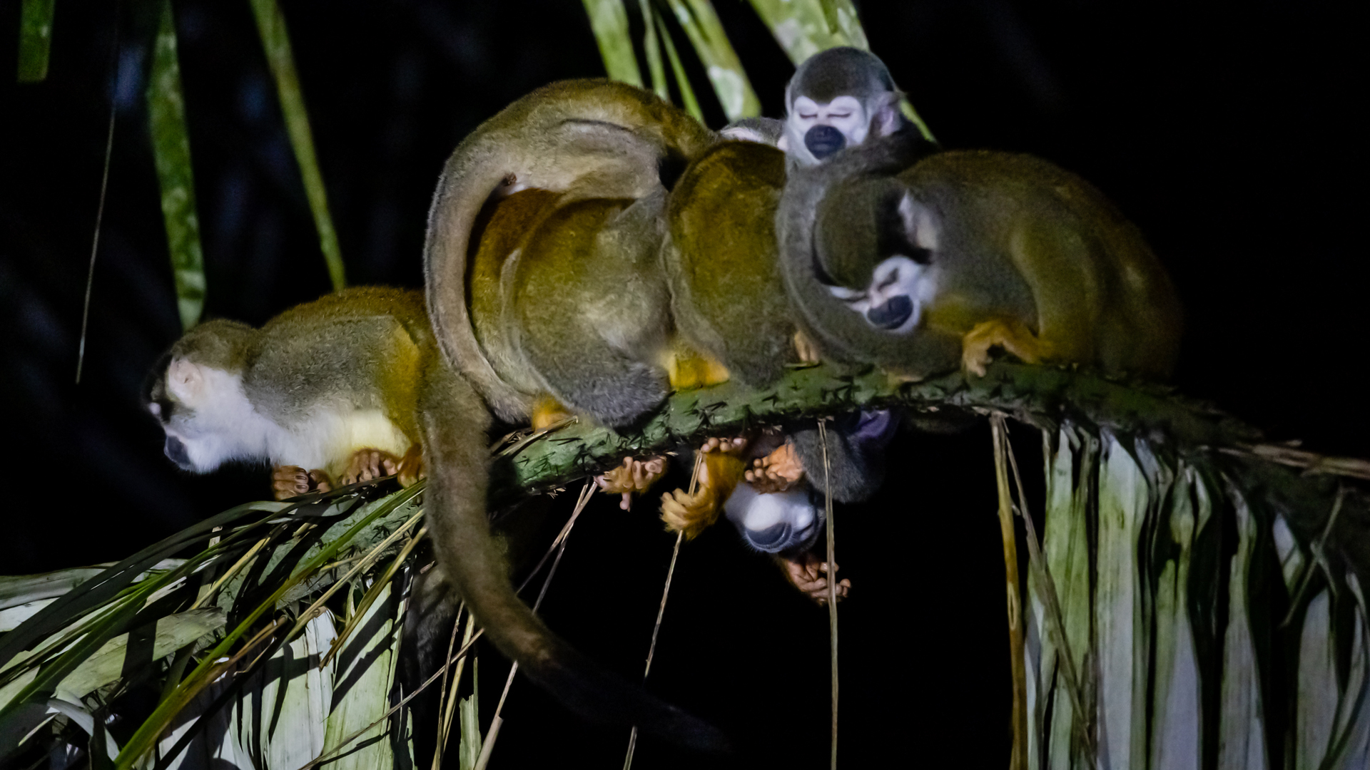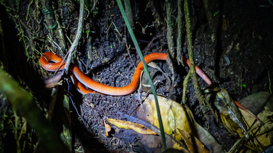 Vacsora után rövid éjszakai túrára indultunk. A sötétben csak a lámpáink fényénél lehetett bármit látni. Az aljzat szinte megélénkült a nappalhoz képest. Már a tábor szélén féltenyérnyi tarantulát láttunk, amely egy négyzetméternyi vadászterületének közepén áldozatára várt. Ennek a póknak nincs az emberre veszélyes mérge, de kellemetlen a csípése. Veszély esetén potrohszőrzetét szétszórja, amit belélegezve tüdőirritációt, vagy akár tüdőödémát okozhat. Áldozataira rárohan, és nem ugrik, mint ahogy sokan hiszik. Békákra, rovarokra, kisebb madarakra vadásznak. Nem eszik meg azokat, csak testnedveiket szívják ki. Láthattunk színes nyílméreg békákat, varangyokat, botsáskákat és félméteres, narancssárga kígyót is. A szállás közelében levő tóban aligátorok vöröslő szempárjai villantak föl a lámpafényben, a házak melletti faágakon pedig egymáshoz bújó selyemmajmok aludtak. Pár méterrel arrébb egy örvös tatu, más néven armadilló futott be a magas al