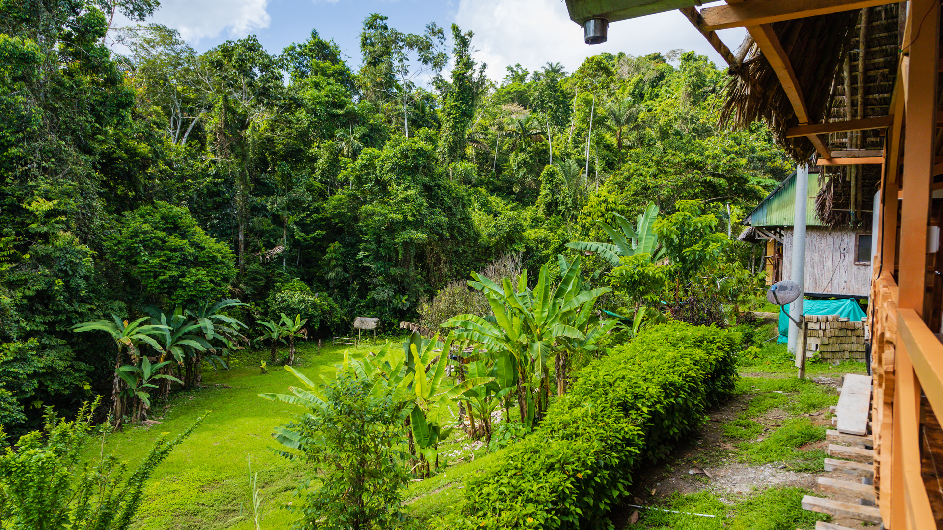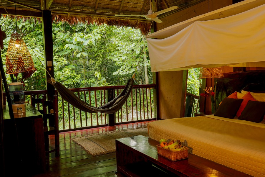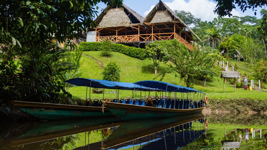 Amikor hosszú, motoros csónakba szálltunk és folyásirányban haladtunk a folyón, jól lehetett látni a bal part letarolt területe, és a jobb part még kevéssé érintett erdősége közti különbséget. Ez az oldal az itt élő őslakosok kezelésében van, akik megtagadták eddig a főleg kínai és amerikai olajtársaságoknak a belépését. Szerencsére ebben a kormányzat is partnernek tűnik, egyre nagyobb területen próbálnak rezervátumokat létrehozni, és inkább a turizmusból bevételt szerezni. Félórás hajókázás közben a viszonylag alacsony vízállás miatt folyamatosan zátonyokat kerülgettünk. Aztán egyszer két fa közé kormányozták a csónakot, ahol mint kiderült, a Manduro folyócska torkollik a Napoba. A keskeny, kanyargós vízi úton még tízpercet haladtunk a fölénk boruló esőerdő lombkoronája alatt. A sűrű növényzettől csak pár méterre lehetett a fák közé látni. Egy kanyar után aztán váratlanul kinyílt a lombkorona, és a dombos tisztásra épített szállásunknál, a Yarina Lodgeban találtuk magunkat. Virágok, bambuszházak, madárcsiripelés. Egy igazi éden. Fantasztikus ebéddel vártak minket, amit a falak nélküli étkezőben szolgáltak föl. Úgy éreztük, mintha az erdő közepén üldögélnénk. Pár órája még egy száraz szigeten ücsörögtünk a teknősök között, most pedig egy másik csoda közepébe csöppentünk. A párás meleg azonnal megcsapott minket. A víz apró kis patakokban kezdett csordogálni rólam, és fogalmam sem volt hogyan fogom túlélni a következő napokat a hőségben.