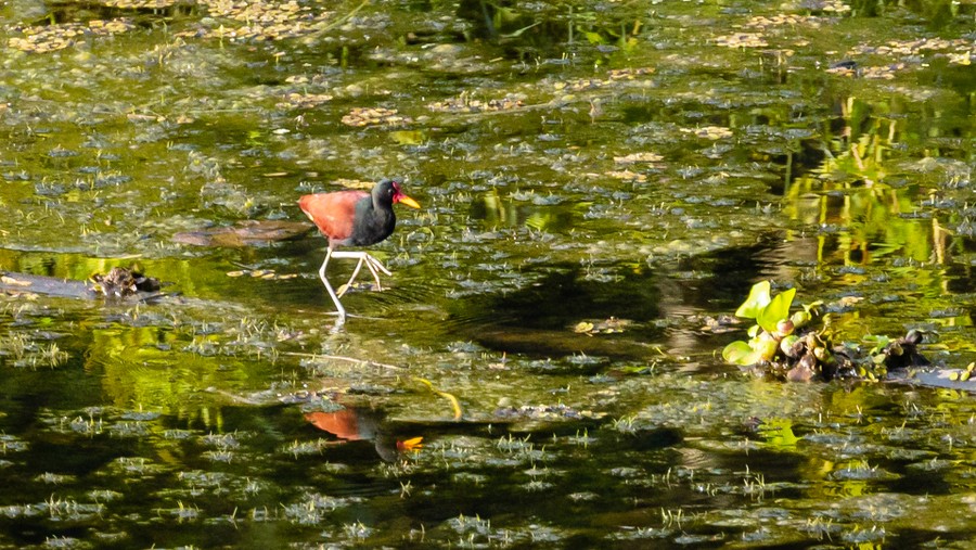 Rövid pihenőt követően túraruhába öltöztünk. Hosszú nadrág, hosszú ujjú ing, gumicsizma. Innentől védekezésképpen ez a felszerelés dukált. Kenuval rövid túrára indultunk egy közeli kis tóhoz, és elkezdtünk ismerkedni a trópusi erdővel. A sűrű lombozat alatt szinte esti sötétség volt. A talajon 10 cm-es ezerlábúak keresték áldozatukat, érdekes gombák bújtak meg az avarban, és vöröses levélvágó hangyák hordták szorgalmasan a testüktől sokszor nagyobb, zöld levéldarabokat hosszú ösvényükön. A fák koronájában madarak bújtak meg. Az egyik legérdekesebb a pulykafélékhez tartozó Dzsungelpulyka, amely fejéről felálló tollaival, rikácsoló hangjával, ujjnyi méretű karmaival, pikkelyesnek tűnő nyakával egészen dinoszauruszszerű volt. Rajta kívül láttunk vékony lábú, hosszú ujjú Jakanát, amely a vízen úszó leveleken lépkedve csipegette hosszú csőrével a táplálékát. Láttunk madarat még sárgát, feketét, kéket és pirosat, amelyek sokszor csak pillanatokra szálltak le egy ágra. Pillangók repkedtek körbe minket olyan gyorsan, hogy a színüket is alig tudtuk kivenni. A barnás, tőzeges vízben nagyobb halak úszkáltak a bomló falevelek között. Ezeket alig észrevehető, kistestű aligátorok figyelték. A csúszós talajon, a sárban néha bokáig süllyedve mentünk vissza csónakhoz, amivel visszavittek a szállásra.