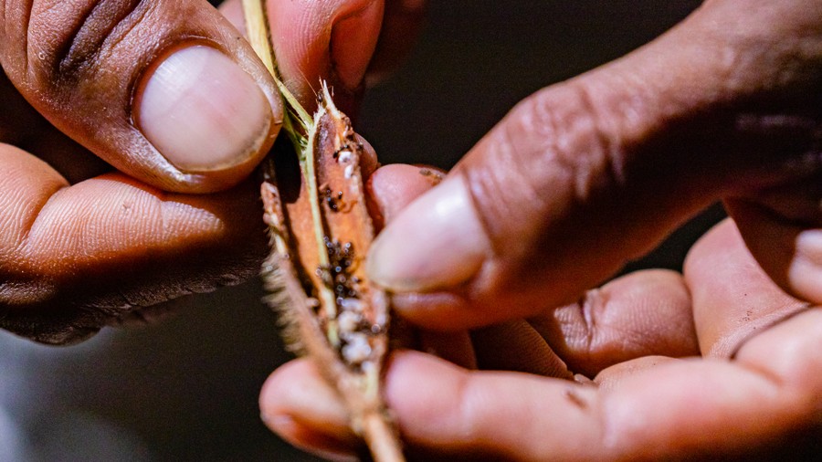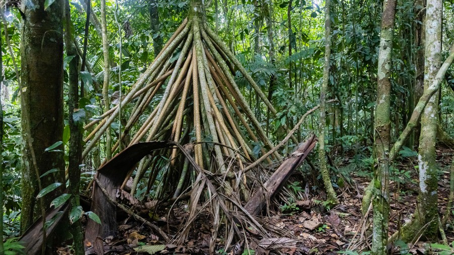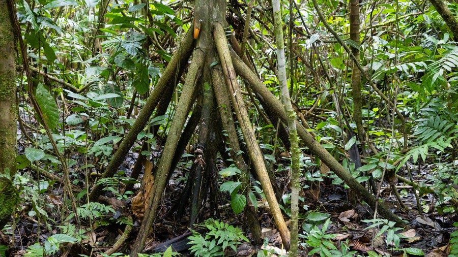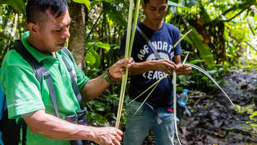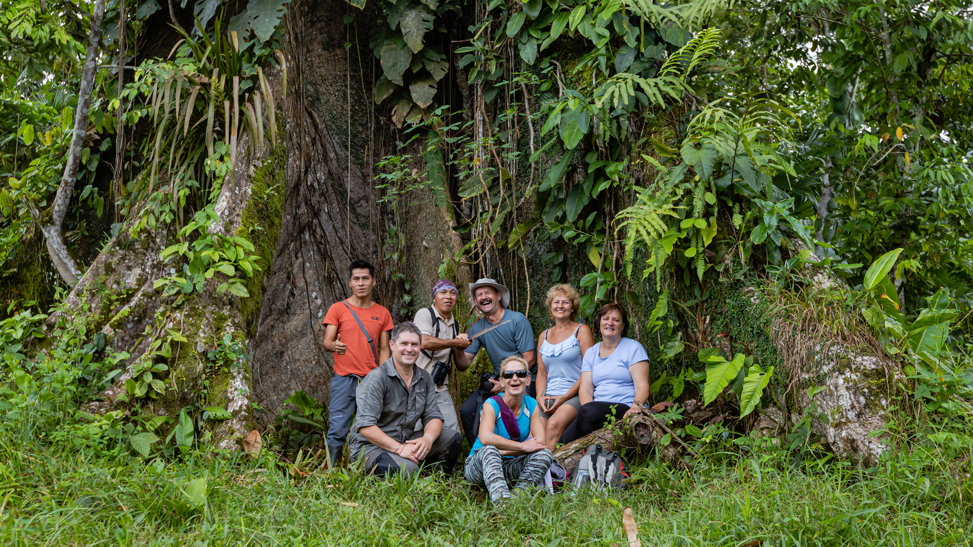 A félhomályos erdőben visszaballagtunk a szállásra, és megreggeliztünk, majd rövid pihenőt követően négyórás sétára indultunk. Minden vizes volt, ami itt normális. Sokszor sárban tapostunk a gumicsizmáinkban, és folyamatosan kisebb-nagyobb növényeket kerülgettünk a meredeken hullámzó ösvényen. Végig félhomályban haladtunk, csak ritkán talált a napfény utat egészen a talajig. Ez leginkább a kidőlt fák helyén volt lehetséges, ahol azonnal rajtra kész magoncok kezdtek az ég felé törni. A rendkívül magas páratartalom és a magas hőmérséklet miatt szinte fulladoztunk a hőségtől. Az arcomról patakokban folyt a víz, a ruhámból pedig csavarni letett volna az izzadságot. A kidőlt fatörzsekből csak apró gyökérzet ágazott szét, amelyen látszódott, hogy csak igen sekélyen futott a föld alatt. Ebből is jól lehetett érzékelni, milyen vékony a termőréteg, ami az állandó csapadék, és a gyors bomlási folyamatok miatt nem tud megvastagodni. Emiatt értelmetlen az erdőirtás, mivel a csekély tápanyagtartalmú vékony földrétegen csak néhány évig lehet kultúrnövényeket termeszteni. Ennek a vékony talajrétegnek a következménye az is, hogy palánkgyökerű fák jelennek meg, amelyek vékony, lapos gyökérágaikkal szélesen megtámaszkodva kapaszkodnak meg. Láttunk olyan helyet, ami nem egy magasabb fa kidőlése következtében alakult ki. A világos, pár méter átmérőjű tisztás közepén csenevésznek tűnő fa álldogált. Ezeket a helyeket a helyiek nagy tiszteletben tartják, mert úgy gondolják, ez a jó szellemek találkozóhelye. A fácska minden apró ágán kicsi, hosszúkás megvastagodást láttunk. Ezekben apró hangyák élnek, amelyek ciromsavat választanak ki. Ez az anyag az, amely a gyökereken át a talajba leszivárogva megakadályozza, hogy más növények is megélhessenek a fa körül. Vezetőnk elmondta, hogy ezek a hangyák ehetők. És valóban. A felnyitott ágduzzanat belsejében félmilliméteres állatkák mozogtak. Kinyalva őket onnan, azonnal erősen savanyú, citromos ízt éreztem. Kicsit tovább haladva, egy pálma mellett álltunk meg. Megmutatták, hogy egyetlen levél összefonásával, majd a levélgerinc felvágásával hogyan lehet abból esőköpeny, ágyat, vagy tetőt készíteni.