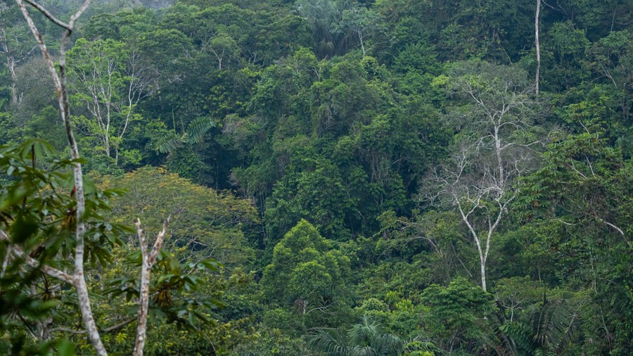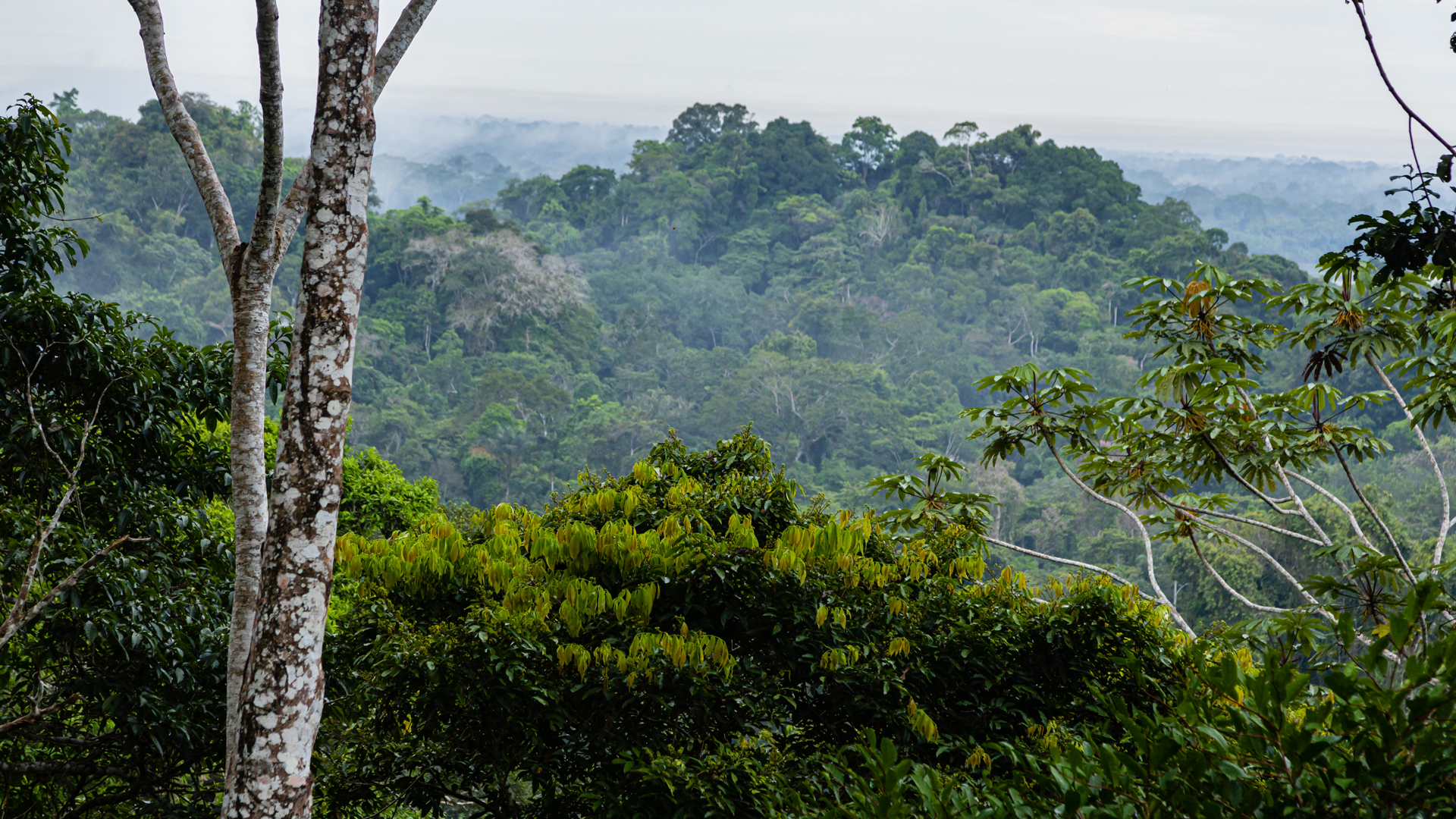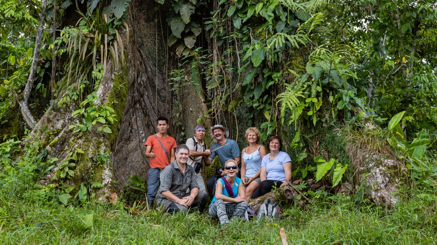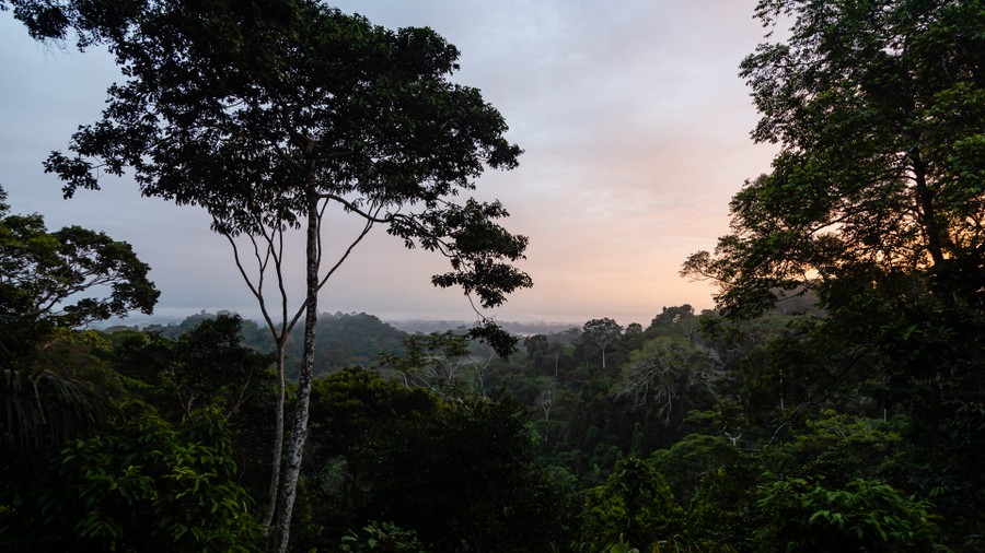 A 15 méter magas fa építményből, a felső koronaszint magasságából szemlélhettük az ébredező tájat. A párába burkolódzó sűrű erdőségből különleges madárdallamokat, majmok rikácsolását, és lombzörgés hangjait lehetett hallani. Mutatkozni nem nagyon akartak az állatok, de a napfelkelte vöröslő ege alatt a lomkorona megannyi zöldje egyre látványosabban mutatta meg színpompáját. A fák egyenként, de folyamatosan hullatták leveleiket. Amit láttunk, az egy másodlagos esőerdő volt. Az elsődlegesnek a legnagyobb fái 50 méteresek, alatta egy harmincméteres szint húzódik, lejjebb magasabb, cserjeszerű növények élnek, és egyáltalán nincs aljnövényzet, mert a talajszintre már nem jut le elég fény. Két növényszint az alsó két koronaszintről felnövő epifiton növényekből áll. A minket körbevevő másodlagos esőerdő a tengerszinttől kicsit magasabban nő, és nincs fölső lombkoronaszintje. Emiatt több fény jut át a lombokon, és kialakulhat az aljnövényzet. Dzsungelnek azt a területet nevezik, ahol már irtottak erdőt, de a természet visszahódította.