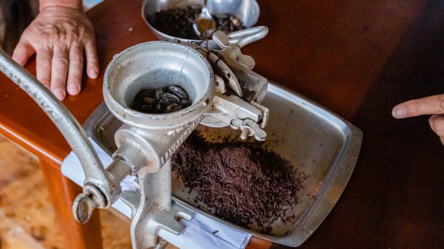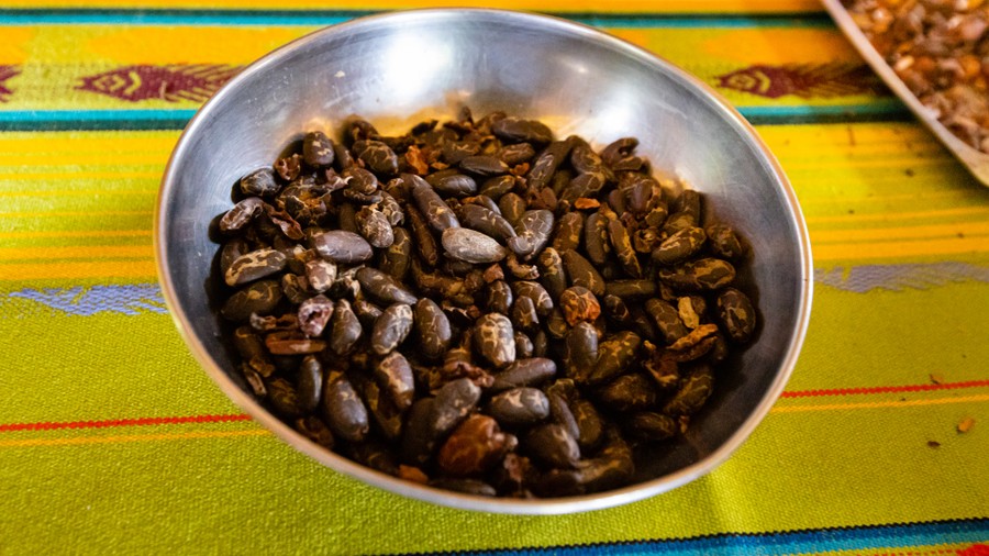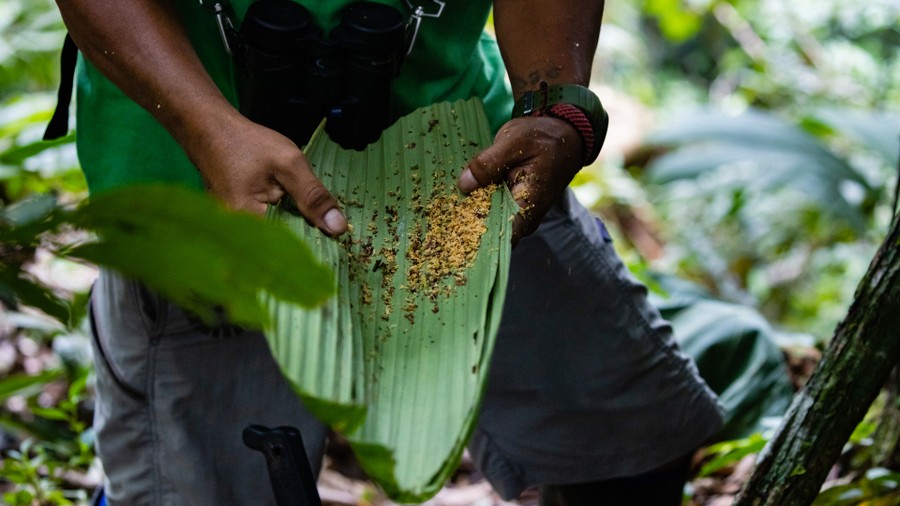 A táborhely felé vezető út mellett láttunk vad papayát, amelynek kétarasznyi törzsét tömzsi, ijesztő, tülökszerű tövisek borították, és láttunk vad kakaócserjét, amelynek a talajszinten sugárszerűen szétágazó, egyenes, sötétzöld ágai 5 méter magasra nyúltak. Termés most nem volt rajta. Ebédre értünk vissza a táborba, de alig hogy megpihentünk, máris szóltak, hogy láttak a közelben egy boát. És tényleg, a talán háromméteres példány egy faág villás tövében összetekeredve pihent a fejünk fölött. Koradélután csokoládét készítettünk. A sárgadinnyényi termésből ki kell szedni a magokat, amiket folyamatos kevergetés közben meg kell pörkölni. Ezután kell megpucolni, mint a napraforgót, majd le kell darálni egy húsdarálószerű szerkezettel, aminek 100%-os reszelt csoki az eredménye. Ezt lassú tűzön tejjel, vaníliával, fahéjjal és cukorral összekeverve kell krémesre főzni. A gyorsan elkészíthető édesség igazán nagyszerűen sikerült. Amikor a konyha mellett lógó banáncsokorról egy darabot letörtem, a szakács elfehéredett, és kézzel-lábbal magyarázta, hogy ez nem embernek való ennivaló, ezt csak főzni lehet. Amikor beleharaptam, még a fejét is elfordította, mert ekkora őröltséget még nem is látott. Mit mondjak? Habár ők ezt inkább csak csirkének adják, vagy megfőzik, én ilyen finom banánt talán még soha életemben nem ettem. A desszert elfogyasztása után egy jókora banánfürtöt tettek egy erdőszéli asztalra. Csakhamar megérkeztek az édes csemegére áhítozó selyemmajmok. Félénkek voltak, de éhesek. Emiatt a lombok közül épp hogy csak leszaladtak, elkaptak egy banánt, és már rohantak is vissza a zsákmánnyal. Az ágak biztonságában aztán kibontották a csemegét, a héját elhajították, az ízletes belső részt pedig a pofájukba tömték. Ezután újra nekivágtak a beszerző útnak. A nagy csődületre a fűben megjelent két fekete, kiskutya méretű, patkányformájú rágcsáló az aguti is, amelyek komótosan körbejárták a területet és összeszedték azt, amit a randalírozó majmok szétdobáltak.