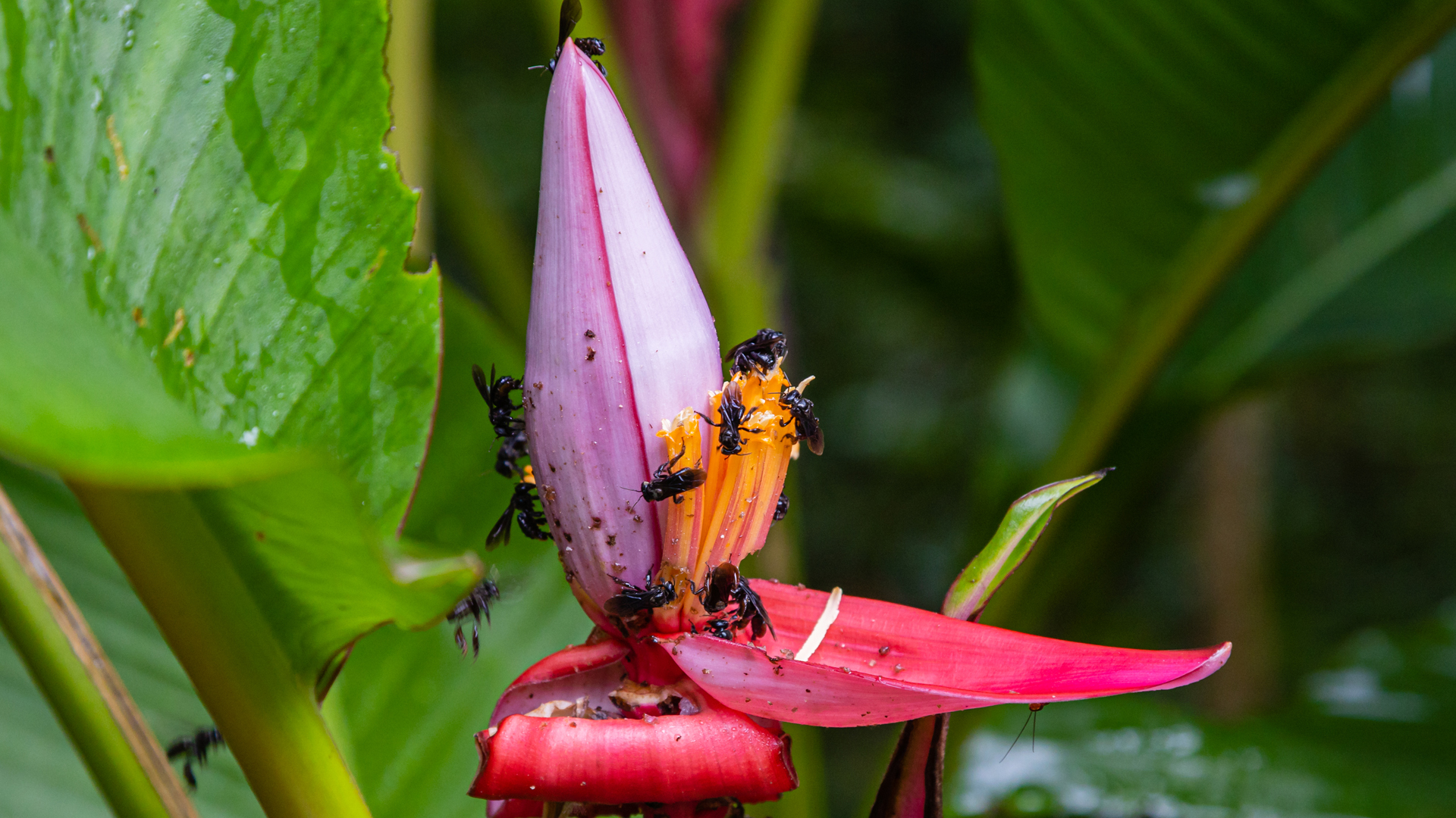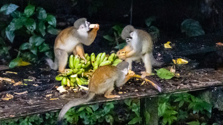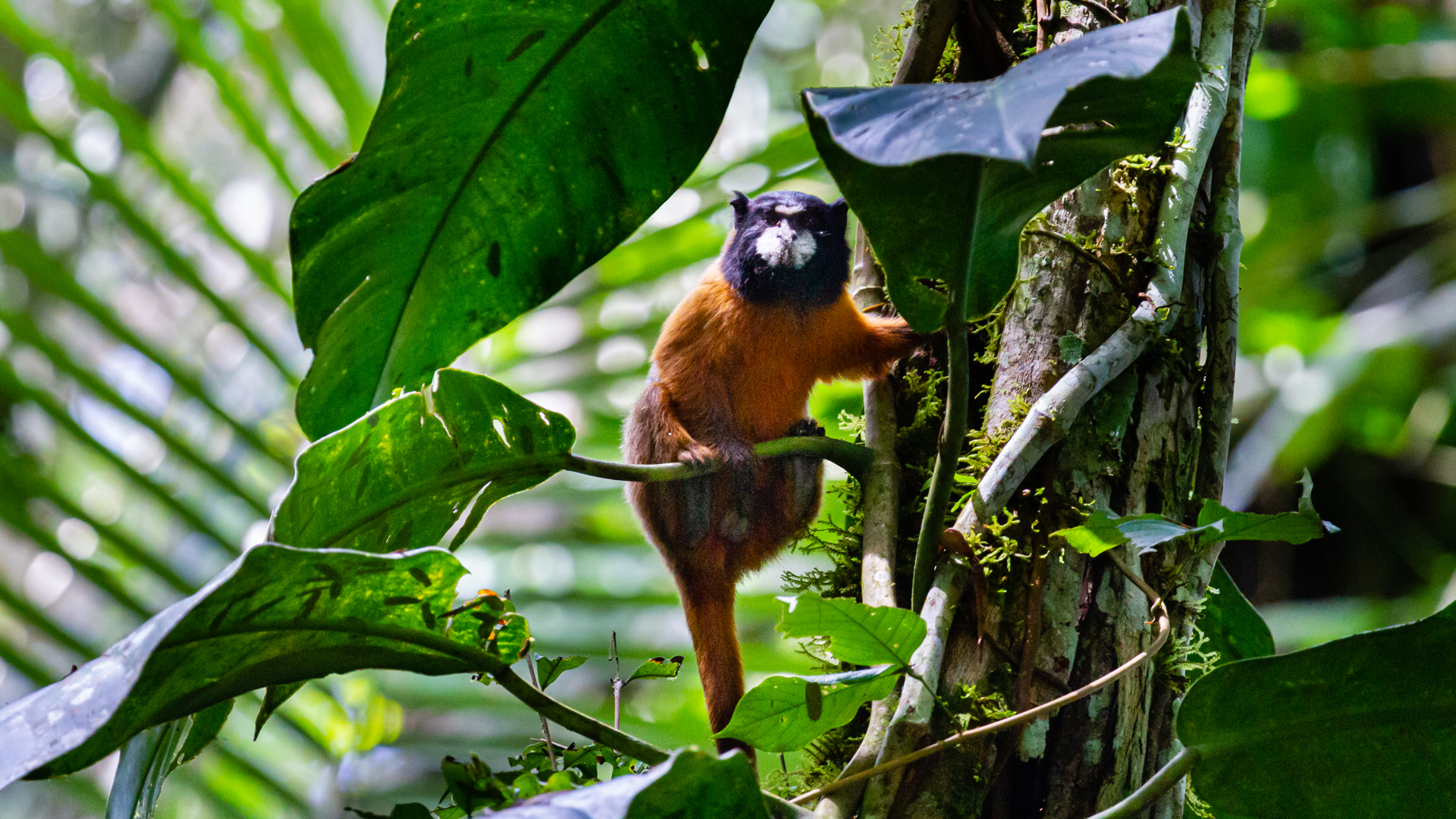 Ahogy tovább haladtunk, minden féle érdekes növényt láttunk. Színes gombák, páfrányok, liánok, pálmák, banánfélék, és még ki tudja mi minden. Nemsokára arra lettünk figyelmesek, hogy erősen mozognak az egyik fa ágai. A lombok között sárgás-vörösesbarna bundájú arany selyemmajmok csapata hancúrozott. Fehér pofácskájukkal folyton figyeltek minket, miközben hosszú farkukkal ügyesen egyensúlyozva szaladgáltak a vékony ágon, vagy ugrottak egyik fáról a másikra. Minden mozdulatunkra gyorsan arrébb álltak. Az út során többször is láttunk nyírméreg békát, amelyet ezen a területen nem használnak vadászatra, vagy ellenség megölésére. Ennek ugyanis olyan erős a mérge, hogy a vele megölt állat elfogyasztásával a szervezetbe kerülő méreg megöli az embert is. Az első, amit láttunk fekete hátsójú, égő vörös felsőtestű, egy centis kétéltű volt, később pedig fekete testű, oldalán sárgacsíkos került elénk. Vezetőnk mutatott egy banánfélét, a panama pálmát, amiből sok mindent készítenek. A friss hajtások rostjaiból erős zsinór készíthető, de legismertebb felhasználási területe a panamakalap készítése. Ez a vízálló, könnyű fejfedő elmaradhatatlan viselete a közép-Amerikában előforduló fehér embernek. A csak itt termő növény nem Panamáról kapta a nevét, hanem fordítva. Rostjaiból fejdíszt is készítenek.