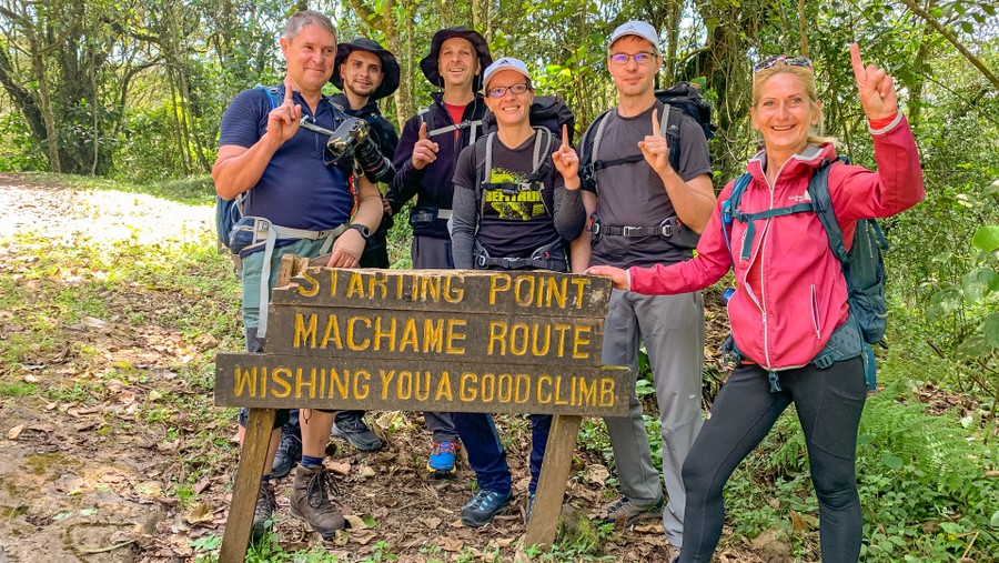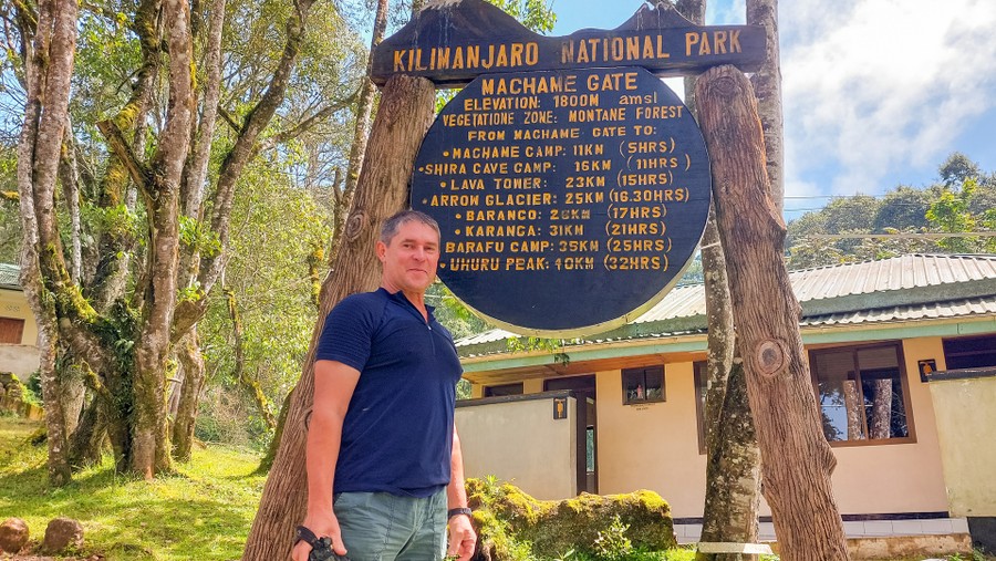 Egy órát sem tartott a busszal az út, a túra 1800 méteren található kezdőpontjáig, a Machame-kapuig. Nevét a Kilimandzsárótól délre élő népcsoportról kapta. Még mielőtt oda értünk volna, megmutatta magát a hegyóriás. A reggeli napsütésben teljes pompájában láthattuk. Hatalmas sziklatömegét foltokban hó borította. Sem a távolságát, sem a magassággát nem tudtuk igazán felfogni, de a legmagasabb csúcsának a megcsodálásához fájdalmasan magasra kellett nézni. Ekkor már eluralkodott rajtam a várakozással teli izgalom.