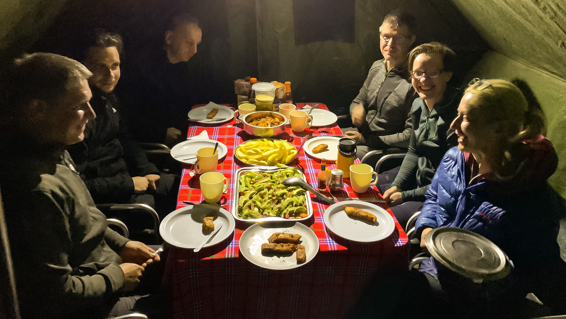 Egy igazi sátorváros várt ránk, ahol a lent látott embertömeget szállásolták el. Nekünk volt étkező sátrunk és mobil WC-nk is. A kilátás pompás volt. A sziklaperemen túl végeláthatatlan felhőréteg terült el, amelyből csupán a magasabb hegyek emelkedtek ki. A pompás vacsora végére nagyon lehűlt a levegő, talán öt fok lehetett, de ezt a magasság és a fáradtság miatt jóval hidegebbnek éreztük. A koromfekete ég teljes pompájában mutatta meg azt a csillagtengert, amelyen fehér szalagként futott végig a Tejút csillogó sávja. Ez viszont csak egyet jelenthetett. Reggelre még hidegebb lesz. Még egy dolog miatt kezdhettem izgulni. Hoztam-e elég ruhát, ki fogom-e bírni a hideget? És a hideg éjszakát, amikor nem mozgok?