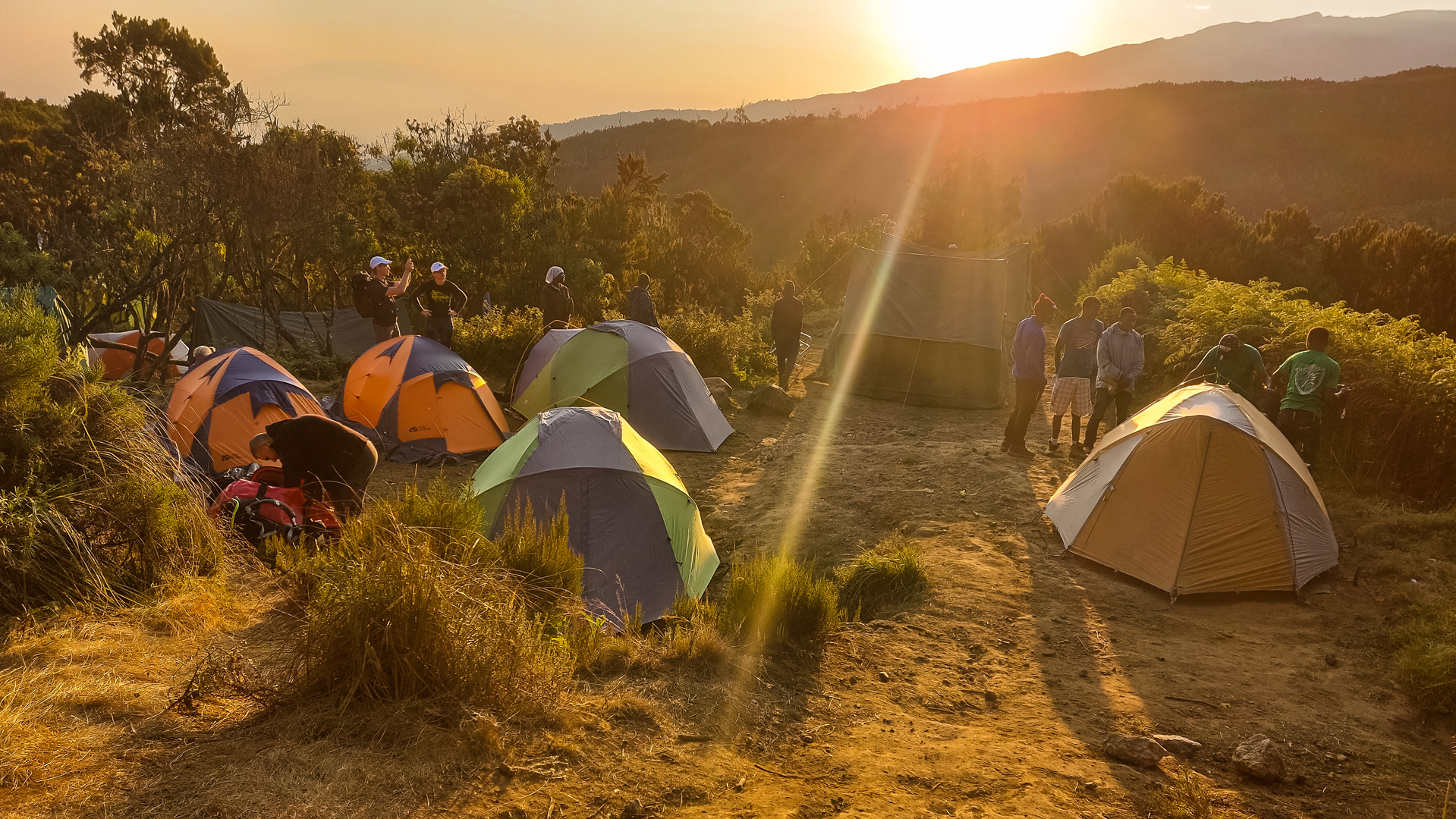 Több rövid pihenőt beiktatva hat óra alatt tettük meg a 12 kilométeres távot, amelynek során 1200 métert emelkedve, 3030 méteres magasságba jutottunk. Itt értük el a Machame tábort, amely egy kicsi, lejtős platón lett felállítva. A legjobbkor érkeztünk. A lenyugvó Nap utolsó sugarai szétoszlatták a felhőket a vulkán csúcsa körül. Ekkor már tisztán láthattuk, hová tartunk. A célunk még háromezer méterrel magasabban volt, amit innen még egy harminc kilométeres úton lehet elérni. Ekkor már kezdtem érzékelni a hegy nagyságát, ami egy kis félelemmel, de még több izgalommal töltött el.