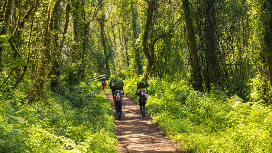 Az ösvény folyamatosan és meredeken emelkedett. Az idő remek volt, tiszta ég és húsz fok körüli hőmérséklet. Magashegyi, trópusi esőerdőben jártunk, ahol a buja növényzet jótékonyan takarta el a mégoly távoli célunkat. A fák törzsét vastagon borította a moha és a zuzmó, ágaikról zöld drapériaként lógtak a kövér szakálzuzmó telepek. Az aljnövényzet nagyrésze saspáfrány volt, melyek között gyakran megjelentek a páfrányfák, és néhány apróvirágú lágyszárú is. Nehéz volt a gyaloglás, ráadásul sokszor igen magasakat kellett lépni, a gyökerekből és kövekből álló természetes lépcsőkön. Az emberáradat folyamatos volt. Az alaszkai aranyláz idején készült képet láttam magam előtt megelevenedni, amelyen egy végtelen sorban kígyóznak az emberek a Chilkoot-hágón a szerencsés megérkezés reményében. Néha mi kerültünk ki megpihenő csoportokat, máskor nekünk kellett félre állnunk a hatalmas csomagjaikat fejükön cipelő hordárok elől. A rengeteg ember miatt nem találkoztunk állatokkal, sőt még madarat is csak néhányszor hallottunk énekelni. Az egyetlen kivétel egy zászlósfarkú kolobusz, más néven gerezamajom csapat volt, amely vidáman hancúrozott a fejünk fölött. Nagy, fehér, bozontos farkukról lehetett megismerni őket. A vékony ágakon akrobatikus ügyességgel másztak és ugráltak.