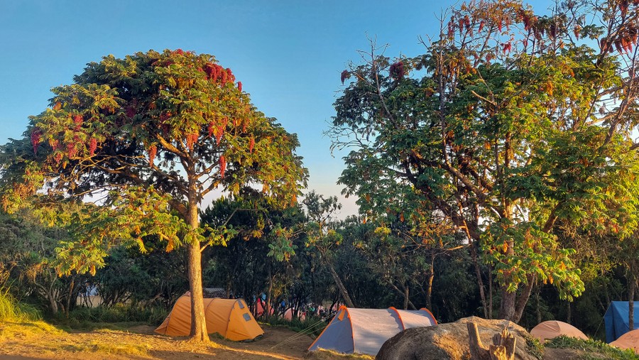 Vacsora előtt a kísérőink egyenként bemutatkoztak és elmondták, melyik törzsből jöttek, hogy hívják őket, és mi a feladatuk. Mi magunk is bemutatkoztunk, és elmondtuk miért vagyunk itt. Én magam annyit mondtam, hogy ötvenévesen eljutottam egy ötezresre, most pedig hatvanéves koromra meg szeretném lepni magam egy hatezressel. A bemutatkozást követően előadtak két olyan éneket, amelyből áradt az energia és a vidámság, amely egyébként alapvetően jellemezte a stábunkat. Mielőtt megterítettek nekünk, még láthattam, ahogy a Nap utolsó, aranyló sugaraival izzóvörösre festi a Shira bazalttönbjét, majd hirtelen alábukik a Meru mögötti felhőóceánba.