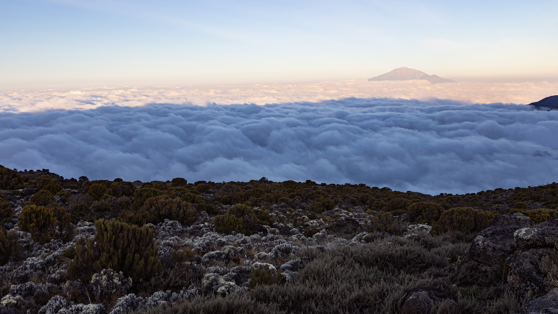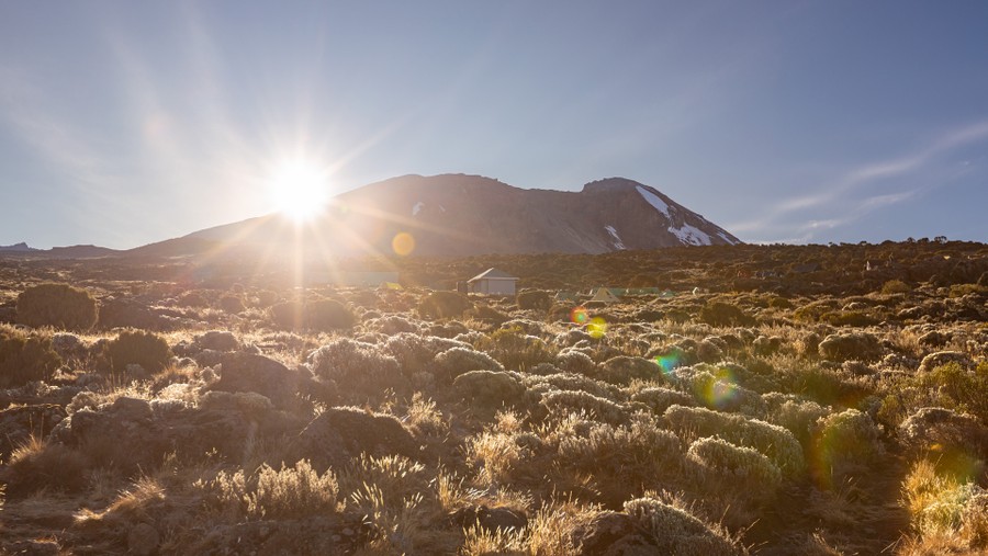 Nyugati irányban a kápráztatóan fehér felhőpárnából a Meru-hegy 4500 méteres csúcsa emelkedett az ég felé. Neve csupán véletlen egyezés, semmi köze a hindu hitvilág szent hegyéhez, az Tibetben van. A porladó kőzet púderszerűen finom pora vastagon belepte a bakancsunkat és a nadrágunkat, mire megérkeztünk a 3850 méteres magasságban felépített Shira táborba. A 900 méteres szintemelkedést 5,5 kilométeren tettük meg, amihez 5 órás gyaloglásra volt szükség. A tábor a Kilimandzsáró legöregebb és legalacsonyabb vulkáni kráteréről kapta a nevét, aminek a szélére építették. Meleg ebéddel fogadtak minket, ami nem csupán jól esett a fárasztó hegymenet után, de finom is volt. Ebéd után kiültem az étkezősátor mögé és megigézve bámultam a Kilimandzsáró előttem magasodó szabáyos vulkáni kúpját. Eközben a keletkezéséről és a magyar vonatkozásáról jutott eszembe néhány gondolat.