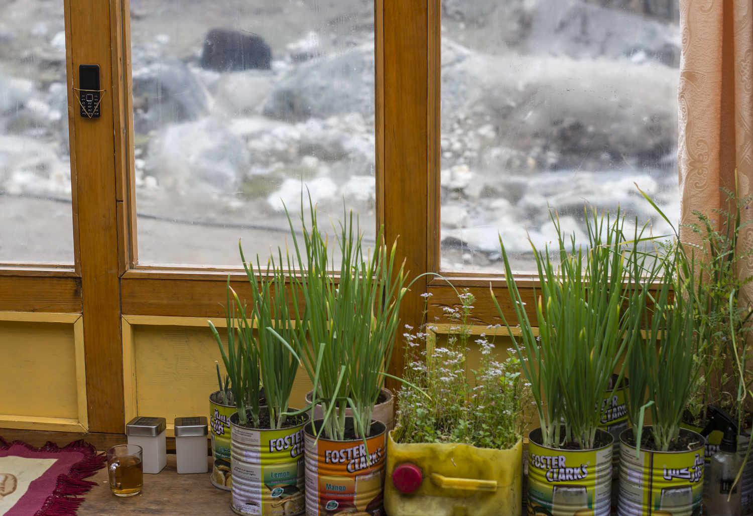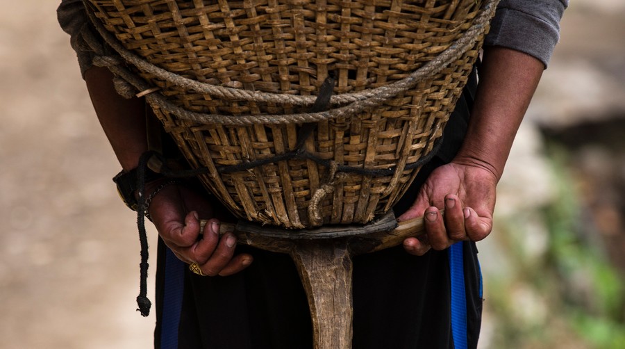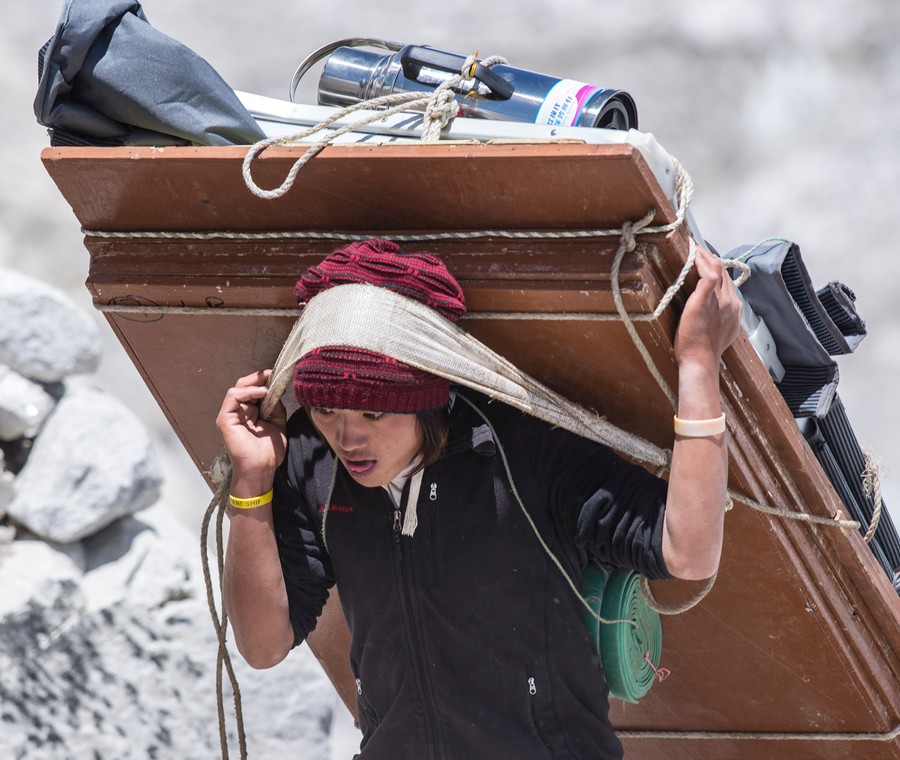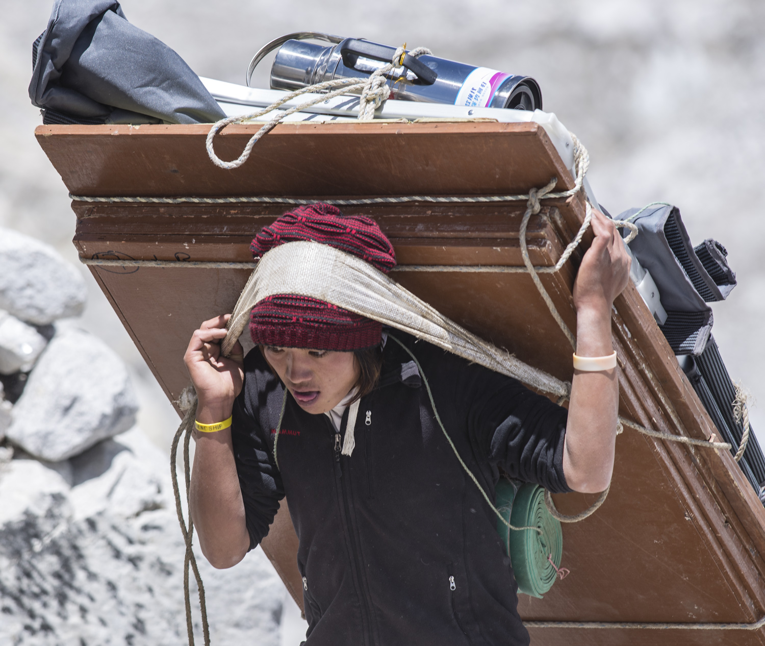 A hegyekben csak gyalog lehet közlekedni (na jó még helikopter), így a karton fanta, a lodge falaként szolgáló farostlemez, a gázpalack, a vizeshordó mind mind az ember vagy az állat hátán szállítódik rendeltetési helyére. A porterek több 10 kg-nyi cuccal száguldanaj a Himalája rögös útjain fel és le, mi pedig még a kis 10 kg-os hátizsákjainktól is masszírozzuk a hátunkat esténként….