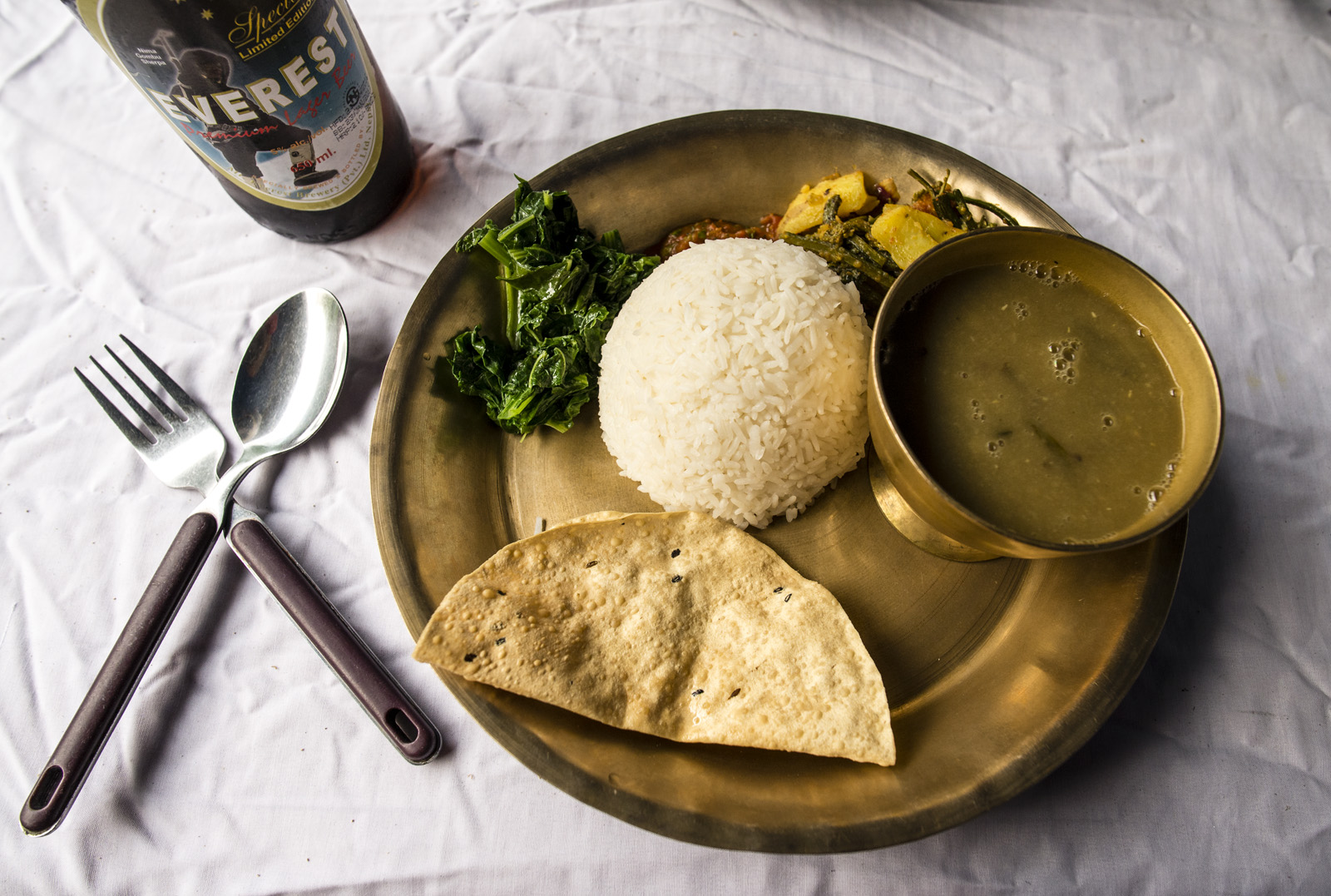 Az étlap kb mindenütt ugyanaz, édes, cuki angol spelling elírásokkal (BREAK FAST). A kaját a guideodnál rendeled, akinek minden szálláson van egy kis füzete, amibe írja a fogyasztásod és azt reggelente összeadja és kifizeted rupiában. A menü népszerű elemei: sűrű thukpa leves, vagy sherpa stew főleg ebédre, fokhagymaleves magashegyi betegség ellen, sült tészta (mixed fried noodle), zöldségekkel, kis sajttal és esetleg tojással, fried vagy boiled momo (amolyan zöldséges vagy húsos derelye), sült rizs és a repetaképes Dal Bhat (rizs, lencse és zöldségcurry). A megfelelő folyadék-háztartásról pedig a ginger vagy menta tea gondoskodik, no meg arról is hogy lefekvés után 2-3 órával menetrendszerűen ki kelljen mászni a meleg hálózsákból és megejteni egy fejlámpás sielős pisilést kint.