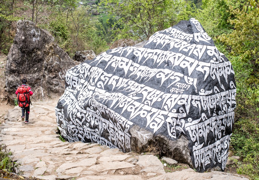 A sziklákba vésett vagy festett, imamalmokon megjelenő mantra, az Om amni padme hum (Éljen a lótusz drágaköve!) a vallás alapítója és spirituális vezetője Guru Rimpoche előtt tiszteleg, akiről úgy tartják, hogy egy tó közepén nyíló lótusz kelyhében született.