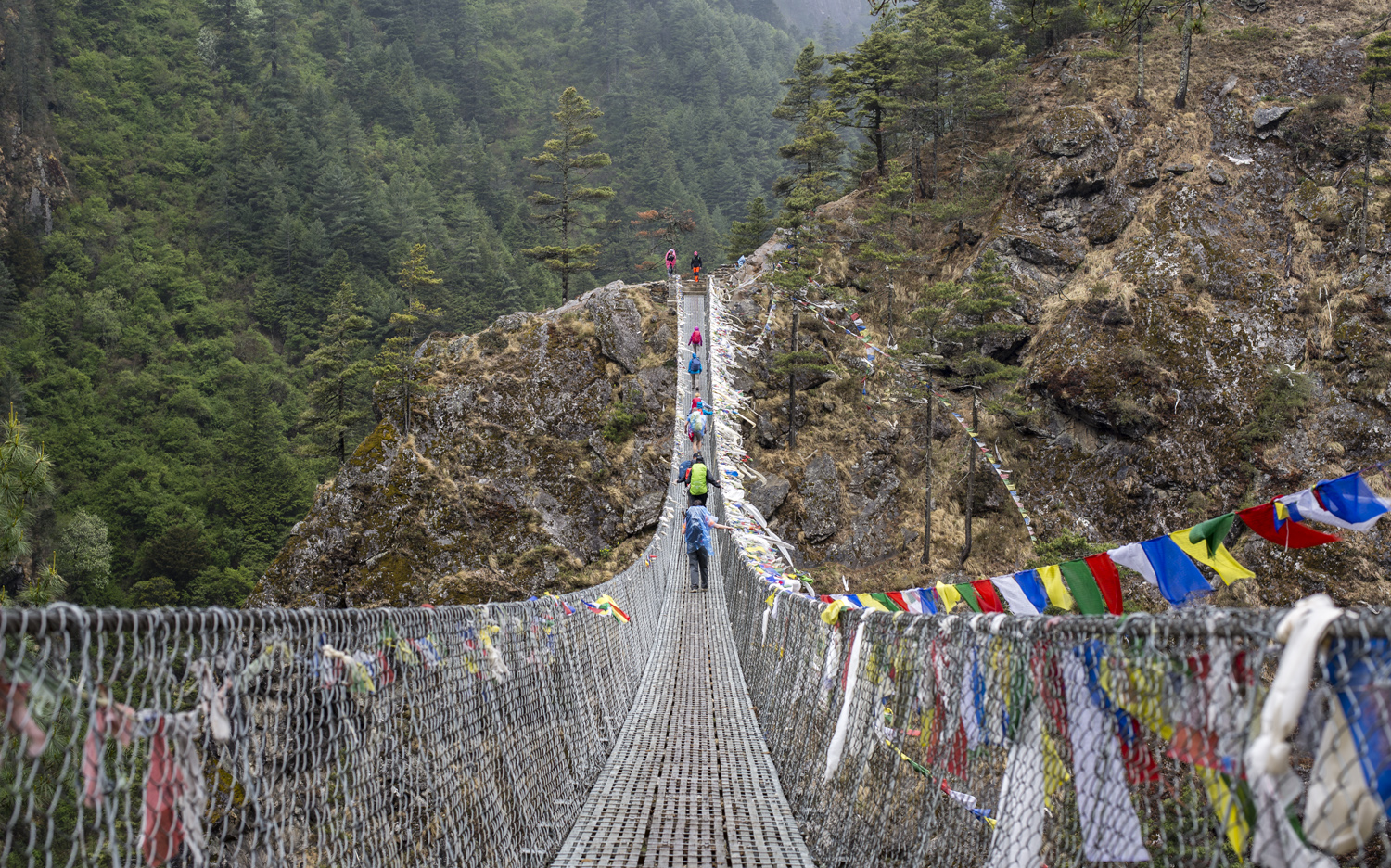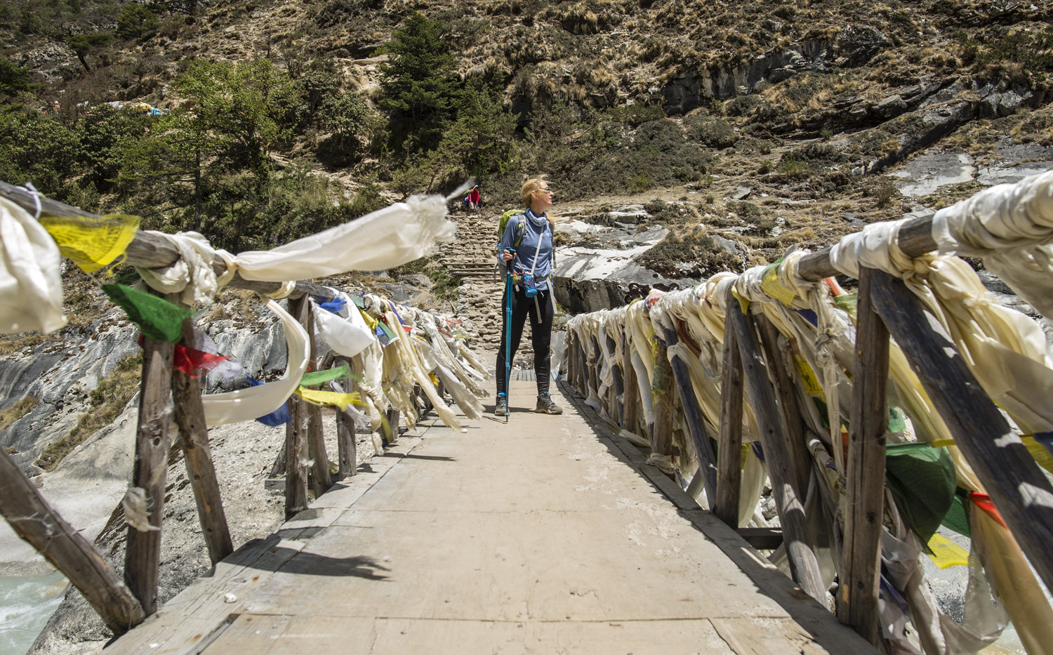 Az első híd nekem kicsit sikongatós volt, ráadásul félútról hátraarcot is kellett nyomni, mert jöttek a jakok. A további hidakon szoros arckifejezéssel, fotózni nem megállva, de néha kikacsintva a látványra, de de sikítás nélkül haladtam át, két hét múlva amikor ugyanitt jövünk visszafelé már csak röhögtem para magamon.