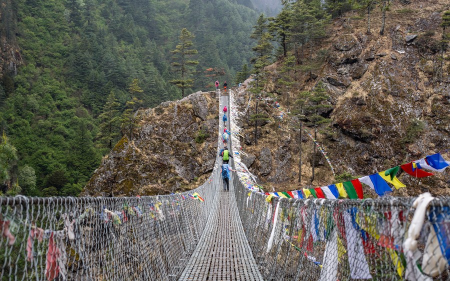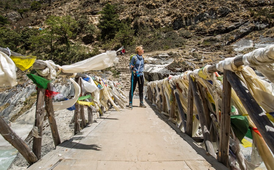 A második nap már mind kilométerben mind szintben egy ambíciózusabb nap. A túra első szakasza egy nepáli flat, számos függőhíddal színezve. Ennek gyakorlati oka, hogy ma egész nap a folyóvölgyet szeljük át keresbe kasba, néha felmászva magasra, majd újra le a folyóhoz. Ezt tesszük egészen a legmagasabb függőhídig majd, ami a Hillary híd.