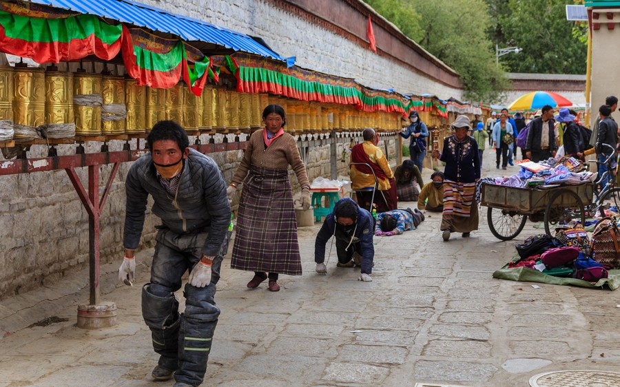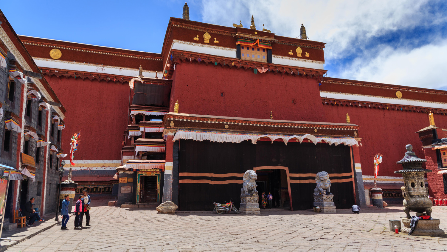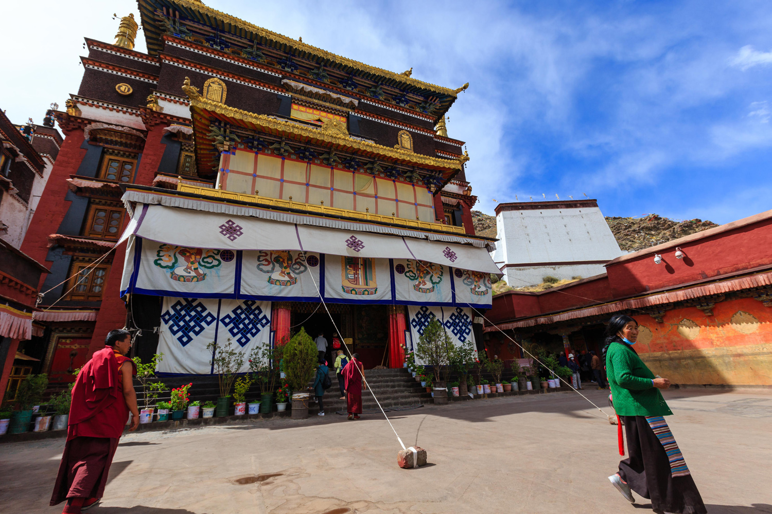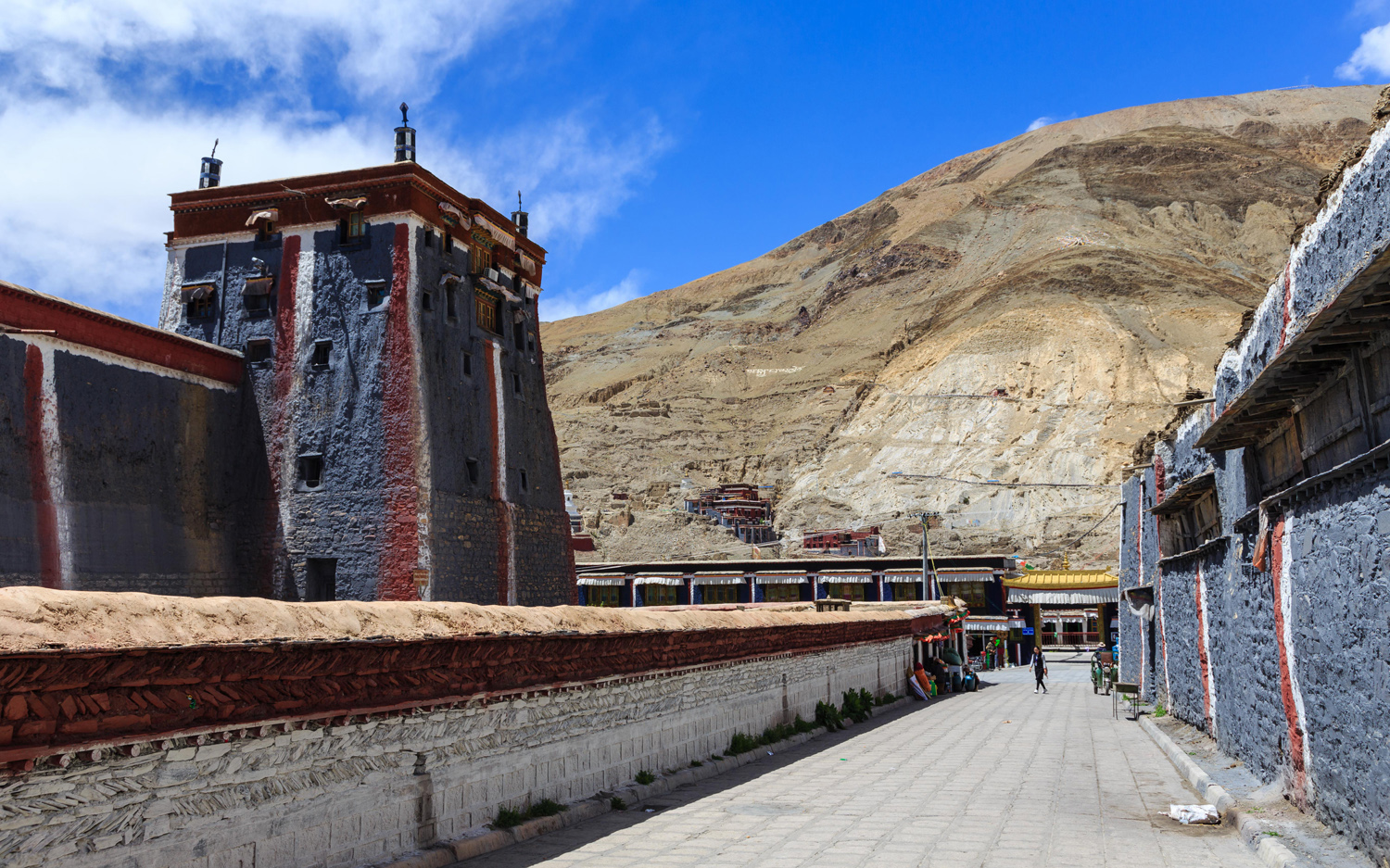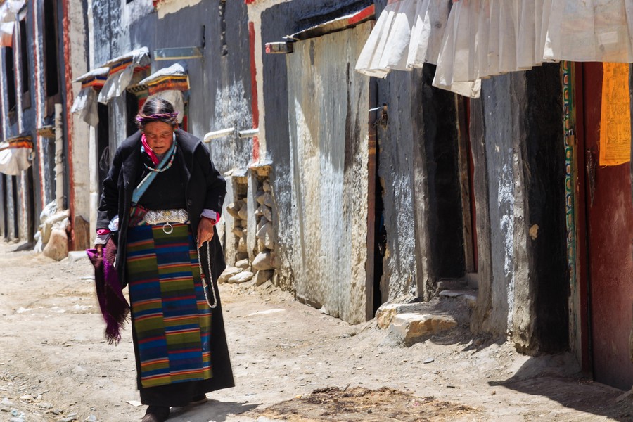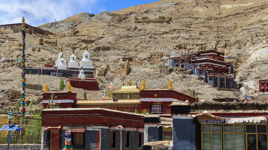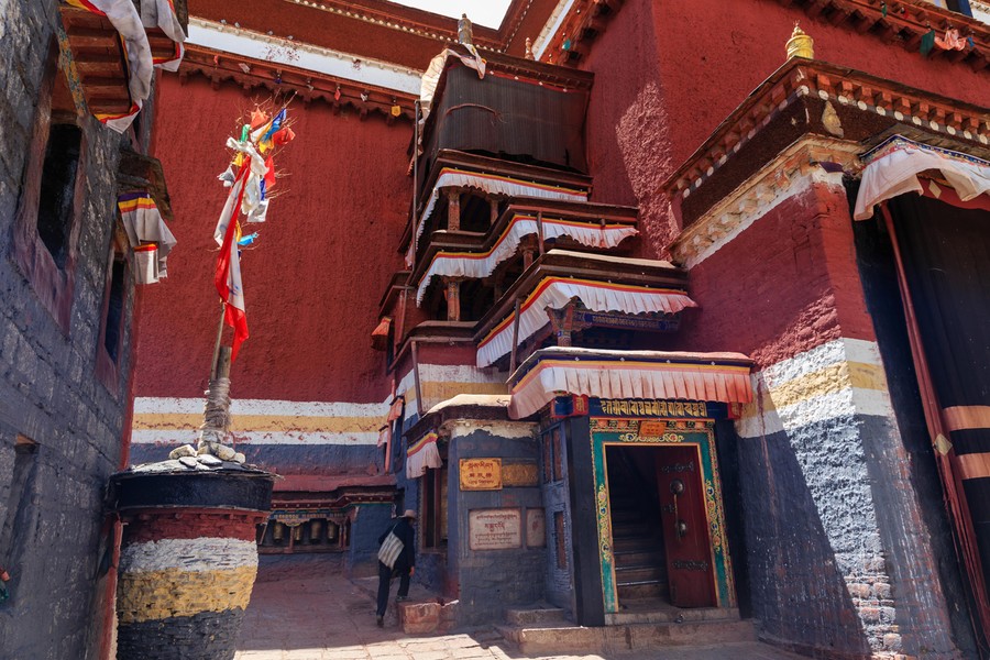 A házakat újraépítették, de mégis időutazás volt a zegzugos utcák fehér falai közti bolyongás. A templomok, amiket csak az egyszerűség miatt nevezek így, valójában az új életbe távozó lámák földi maradványainak díszes sírhelyei, gyönyörű kialakításúak, falfestményeik pedig hihetetlenül aprólékosan kimunkáltak, és újak lévén jól láthatóak. A mécsesek, a víztartó edények és az adománygyűjtő ládikák természetesen itt is láthatóak. A bejáratokat az évszakok ábrázolásai, és Fo Kutyák védik, valamint olyan fekete jakszőr szőttesek, amelyekre fehérrel festették a végtelen csomót, a végtelen szeretet jelét.