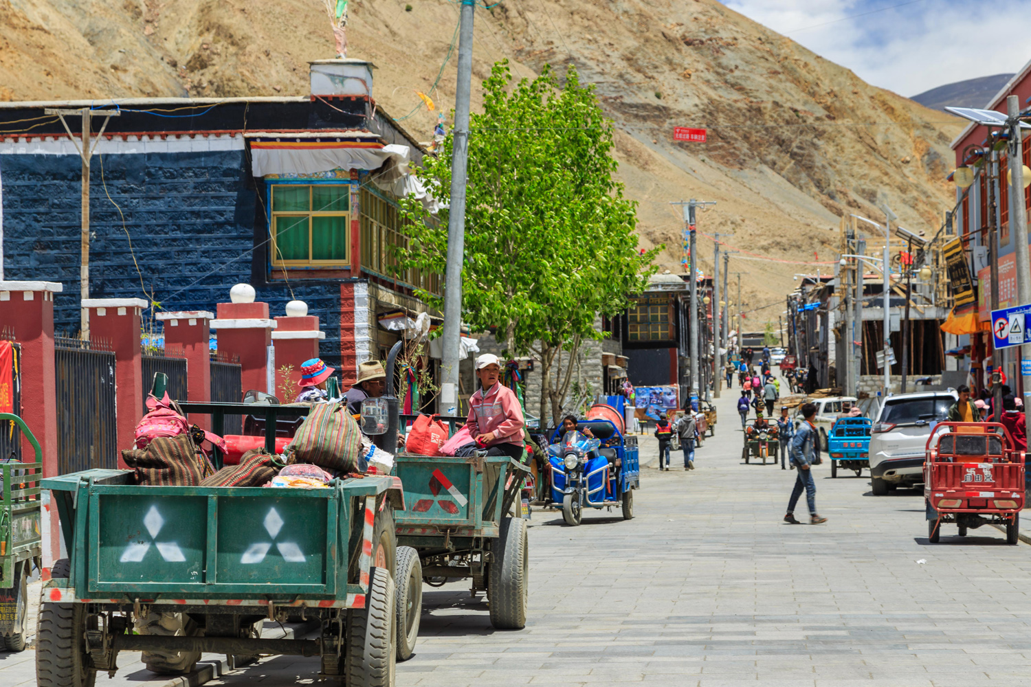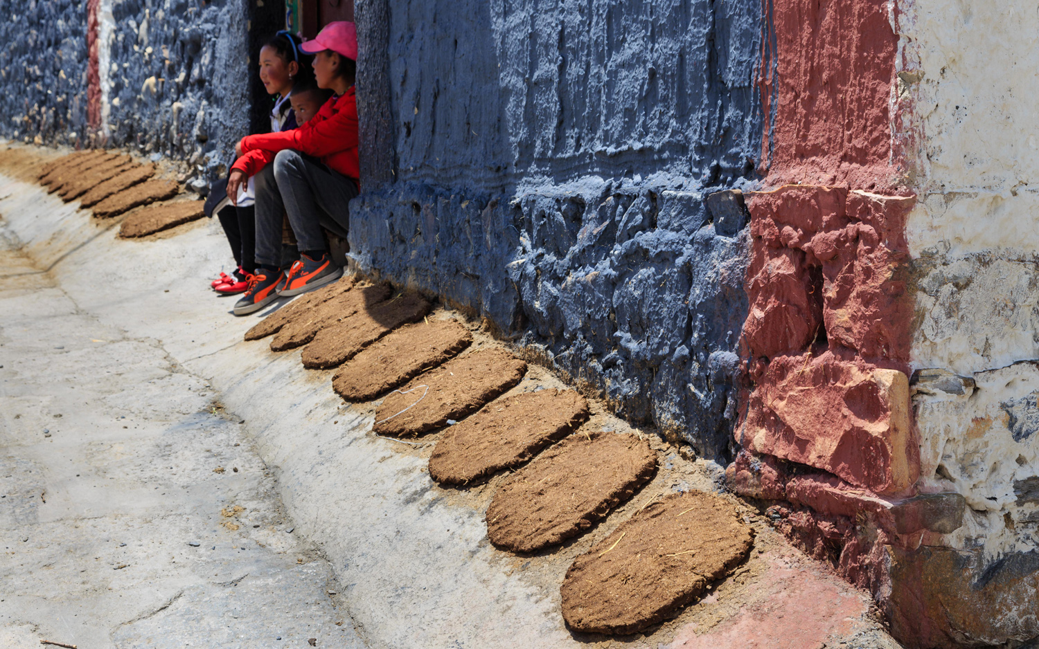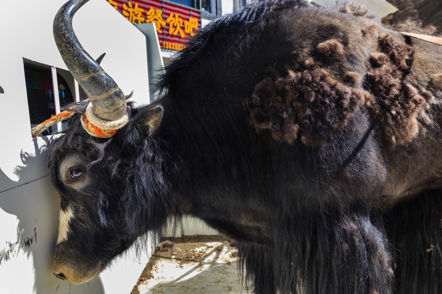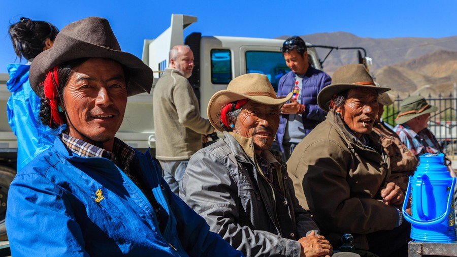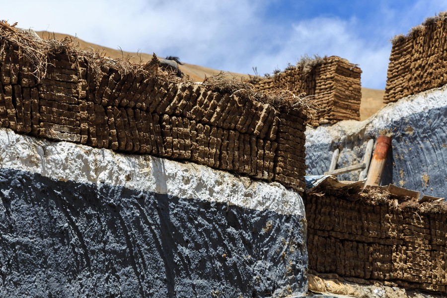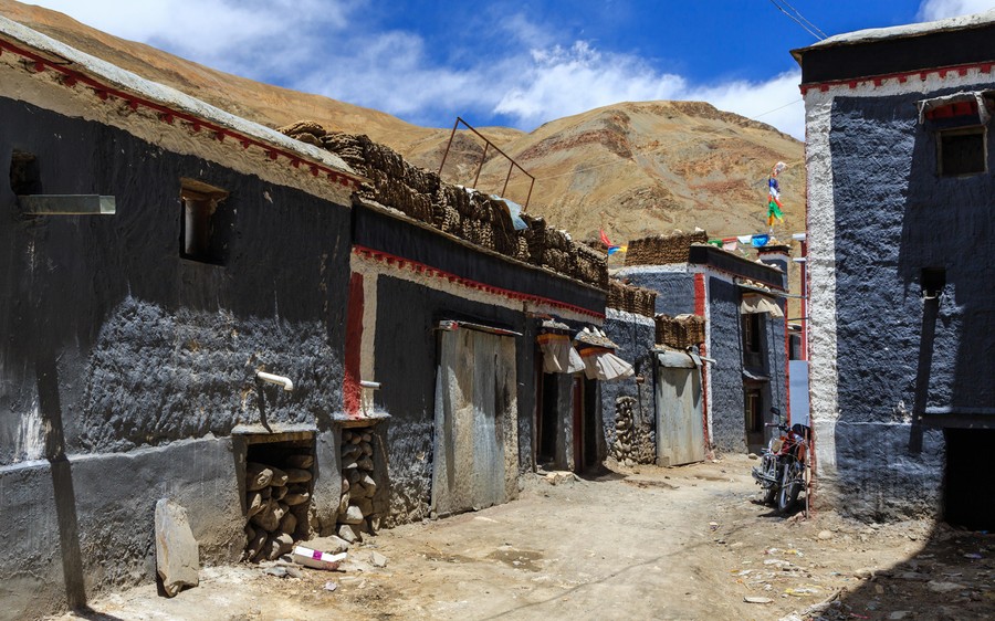 Az út mellet tanyaszerűen helyezkedtek el az épületek, amelyek ugyan régi stílusúak, de új építésűek voltak. A Kínai kormány olcsón adja a helyieknek, csak költözzenek le az út mellé, hogy szem előtt legyenek. De azért itt is a régi életmódot próbálják folytatni. Az udvarokon ott a régi-új felfedezés a lemezből hajlított homorú tükör, aminek fókuszpontjában melegítik a vizet alumínium kannában, de ott a szabályos boglyába rakott szárított jaktrágya is.