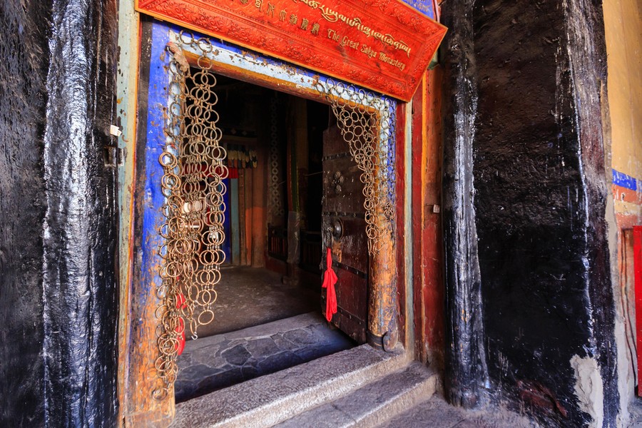 A völgy két oldalára két kolostor épült. Az északit a kulturális forradalom alatt teljesen megsemmisítették, és nem is állították helyre. A déli az szerencsére megmenekült. Felépítése kicsit más, mint amit eddig láttam. Bástyákkal erősített várfalán belül egy hatalmas templomépület található, mögötte pedig ott sorakoznak a szerzetesek cellaházai. A templom bejáratát két óriási, fából készült, szörnyűséges külsejű alak védelmezi. A központi épületrészt negyven vastag faoszlop tartja. Átmérőjük majd egy méteres, magasságuk pedig eléri a nyolc métert. Mindegyiket egy kőkorongra állították.