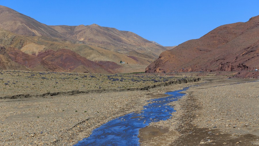 A kietlen tájon a szürkés-barnás-sárgás hegyek meredek oldalán csak mutatóban jelentek meg növények. A víz erodáló hatását így semmi nem lassítja. A vízfolyások mély árkokká, később völgyekké válnak. A nagyobb kődarabok, amikkel a csapadék és a fagy egyelőre nem bírt, bizonytalan egyensúlyi helyzetben szanaszét hevernek, de bármelyik pillanatban megindulhatnak a folyómeder irányába. A további aprózódást a folyó ereje végzi. A valamikori Thetis-tenger mélyéről származó üledék rétegződése jól látszódott. A változó színezetet a lerakódó ásványok okozták.