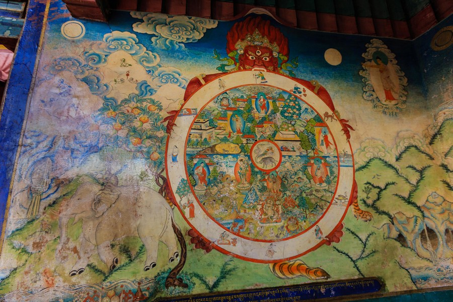 Itt szemléltük meg először alaposabban a Darmát, az életkereket, ami a Buddhista filozófia alapvető ábrázolása. Egy barátságtalan kinézetű lény, a Föld védelmezője tartja fogai és karmai közt az élet körforgását. A festmény három koncentrikus körből áll. A legkülső tizenkét részre tagolt, és az élet legalapvetőbb jelenségeit, annak okait mutatja be. A középső hat részre osztott. A fölső három a fölső, az alsó három az alsó világot ábrázolja. Legfölül az istenek, tőlük balra az emberek, jobbra a félistenek vannak. Alul középen van a pokol, tőle balra az irigyek, az éhezők, jobbra pedig az állatok. A folyamatból csak úgy lehet kilépni, a Nirvánába jutni, ha jól élsz, kijavítod a hibáidat, és legalább egyszer minden mezőben éltél. A kívül álló Buddha mutatja, hogy van lehetőség ennek megvalósítására. A legbelső körben négy állat van, amelyek az elkerülendő rossz tulajdonságokat jelképezik.