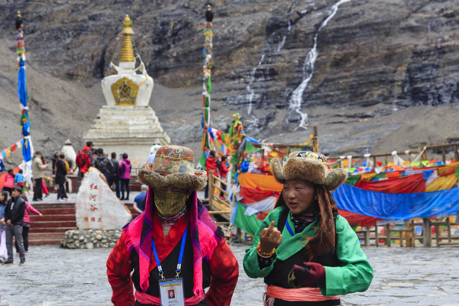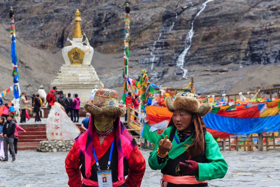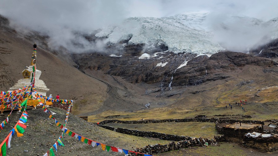 Később az 5.100 méteres Karo-la hágón keltünk át ahol egy gleccser alatt meg is álltunk. 10 évvel ezelőtt néha még az úton is átfolyt, ma már száz méter magasan van a csipkés vége. Az előtérben egy sztúpa imazászlókkal, mögötte a terep gyorsan szinte függőlegessé változott. Az égbeszökő gránitfalon, mint az ereszen függő jégcsapok, úgy lógtak lefelé a ködbevesző hegytetőről induló gleccser ujjszerű végei, melyeken mint az öreg paraszt kezén a repedezett bőr, apró darabokra hasadozott a kékes jégtömeg.