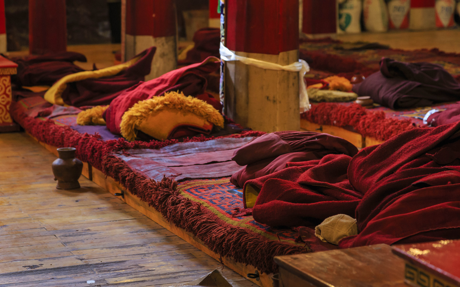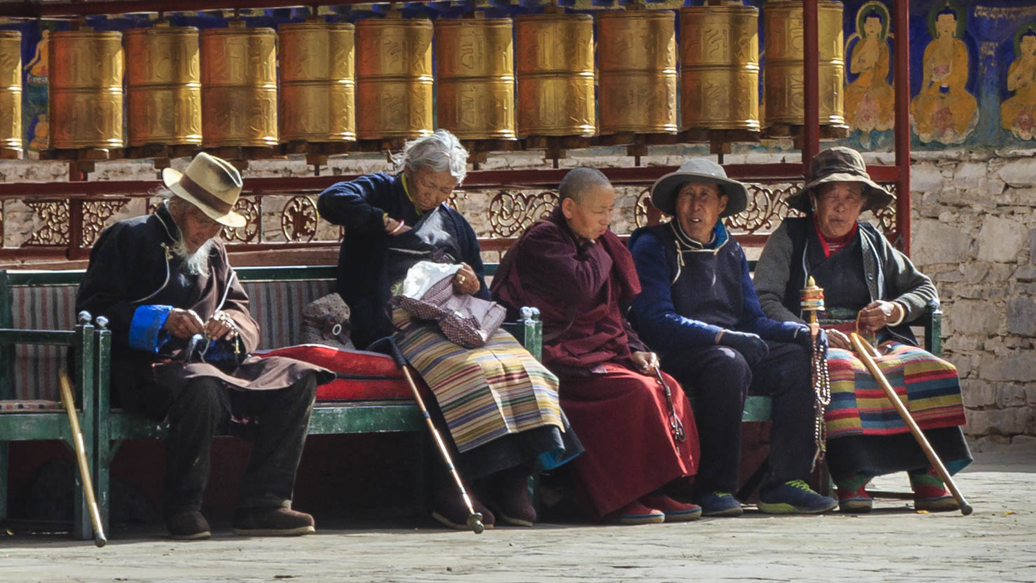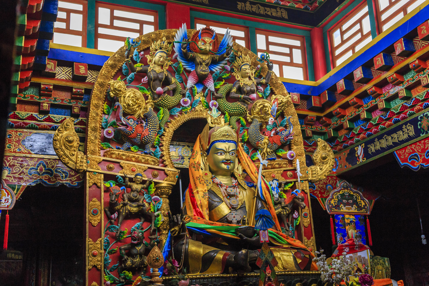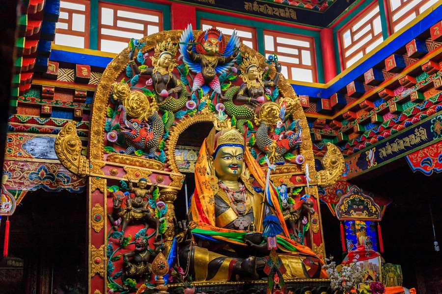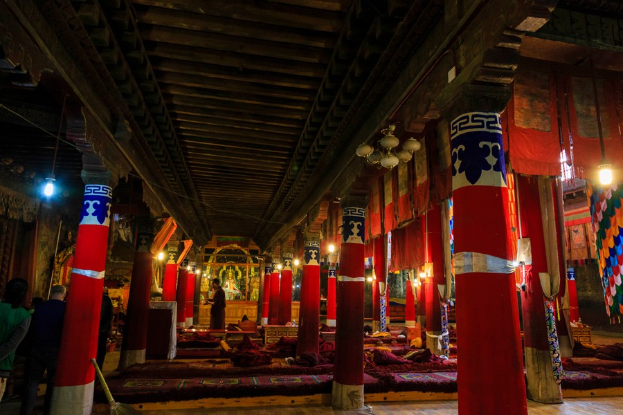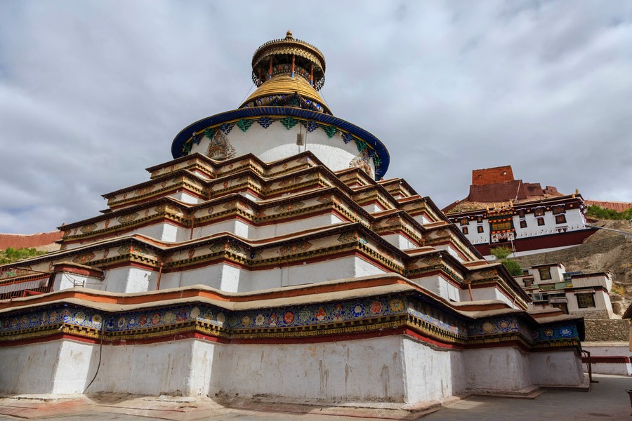 A kolostor legnagyobb szenzációja számomra mégis a templom mellé épített, díszesen festett sztúpa volt. Ez egy igazi háromdimenziós mandala. Alapvetően négyzet alaprajzú, amelynek minden sarkát befordították, egy vaskos keresztet kapva eredményül. Ezekből egyre kisebb méretben ötöt építettek egymásra, melyeket egy henger alakú felépítmény és egy kúp alakú tető tett teljessé. Az egyes szinteket körbe lehetett sétálni, és minden szinten számtalan apró fülkét alakítottak ki különféle Buddhák és segítők szobraival, oldalfalainak díszes festésével. A legfelső szintről nagyon jól át lehetett tekinteni a kolostor szerkezetét, és jól meg lehetett figyelni a korát járás közben imamalmaikat pörgető zarándokokat is.