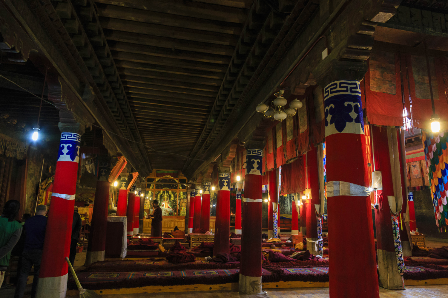 A templom hagyományos felépítésű: középen a vörösre festett oszlopok által tartott mennyezet alatti imaterem felülvilágítóval, körben a falak Buddha ábrázolásokkal díszítve, amelyek gyakorlatilag láthatatlanra feketedtek az évszázadok mécsesmillióinak füstjétől, oldalanként pedig egy-egy oldalkápolnaszerű helység. Az egyik ilyenben hatalmas, álló Buddha szobrok sorakoztak, amelyek a volt és eljövendő Buddhákat ábrázolták. A Buddhista filozófia szerint az ezredik Buddha eljövetelekor minden akkor élő ember megvilágosodik, és Buddhává válik. Közben persze vannak periódusok, amik úgy néznek ki, hogy minden ötödik Buddha után eltűnik a társadalom, és az emberiség a fejlődési spirál új szakaszába lép, ismét a primitív közösségek szintjéről kezdve a tanulást. A mi jelenlegi emberiségünk a negyedik Buddha idején él, és még kétezer évünk van az ötödik Buddha eljöveteléig. Úgyhogy van még előttünk fejlődési lehetőség, és ami a legfontosabb, hogy van hozzá időnk is.