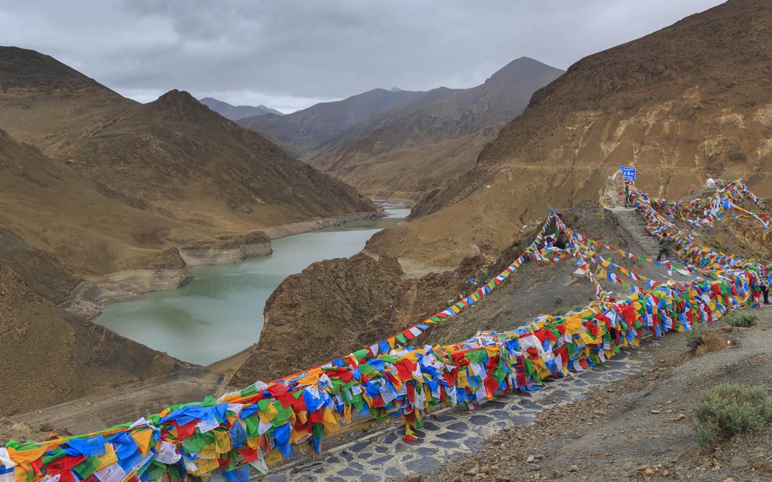 Egy majdnem 5.000 méteres hágón átkelve megálltunk egy víztározó mellet. Ez is jól példázza a Kínaiak rövidtávú, környezetromboló tevékenységét. A tározó alatti területek fokozatosan elsivatagosodnak, mivel a feltartóztatott víz jelentős része elpárolog, más része elszivárog. A kanyonszerű völgy meredek partjai közt kanyargó keskeny, türkiz színű vízszalag felhasználásával előállított látszatboldogság hiú ábrándjával tudják az embereket a városokba, vagy éppen az újonnan épített betonviskókba csalogatni, hogy onnan többé ne legyen menekvésük. Az átutazó katonák vigyorogva pózoltak a kommunista párt eme elévülhetetlen és csodás alkotása előtti fényképezésnél. Valószínűleg még csak fel sem vetődött bennük, hogy a saját, és az emberiség pusztulásának emlékműve előtt pózolnak.