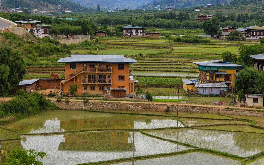Az Éves Nemzeti Összterméket, a GDP-t itt Bruttó Nemzeti Boldogságban mérik. Itt csak 1962-ben jelent meg az első autó, 1974-ben engedték be az első turistát, 1999 óta létezik TV és internet, 2007 óta pedig mobil telefon, és a mai napig nincs egyetlen multi sem. Az egész országban tilos a dohányzás, nem lehet dohányárut kapni, sőt a külföldről érkezőktől az országba lépéskor elkobozzák a cigarettát, de még az öngyújtót is.