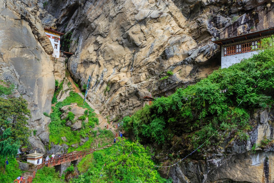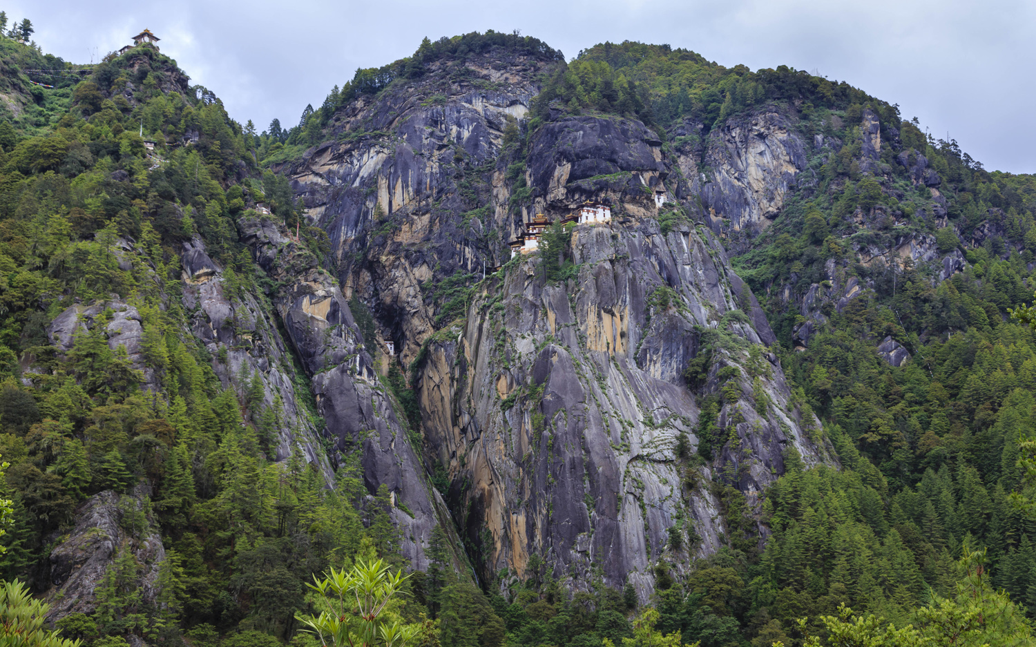 Velünk nem így történt. Éjszaka esett az eső. Az amúgy is magas páratartalom az egekbe szökött, és a köderdő párás lehelete jótékony felhőtakaró mögé rejtette a gyalogtúra célpontját. Szerencsére a talaj már nem volt nedves, de az út igen meredeken kapaszkodott fölfelé. Eleinte ritkásabb erdőségen haladtunk keresztül, de a meredek, poros, sziklás ösvény mellett egyre gyakrabban jelentek meg a rododendron fák, ami később rododendron erdővé vált. A fákon megjelentek a gyönyörű, bordó színű virágok, az ágaik pedig rogyadoztak a rengeteg rátelepült páfrány és Thillandsia súlya alatt. Madarak csiviteltek minden felé. Eléggé idilli lett volna a kép, ha a csökkenő oxigénszintben nem fölfelé kapaszkodtunk volna a meredek ösvényen, miközben szakadt rólunk a víz. Félúton jártunk, amikor pihenőt tartottunk egy teázóban. Ott felhőoszlató teát kaptunk. Ránk fért, mert még nem láttuk, hová igyekszünk. Felhörpintettük a meleg italt, és mintegy varázsintésre, apró nyílás keletkezett a párarétegen, és előbukkant a kolostor sziluettje. Aztán a vonuló felhők ismét eltakarták, de lehetett érzékelni, hogy ez az állapot már csak rövid ideig fog tartani. A melegedő hőmérséklet kezdte ködfoszlányokra szaggatni a felhőket. De eddigre mi már megint gyalogoltunk.